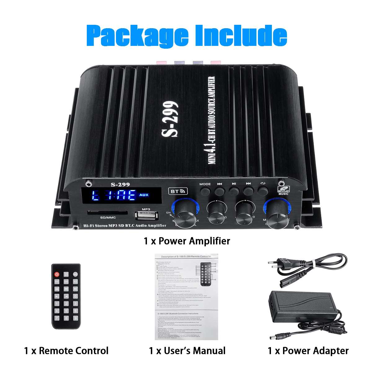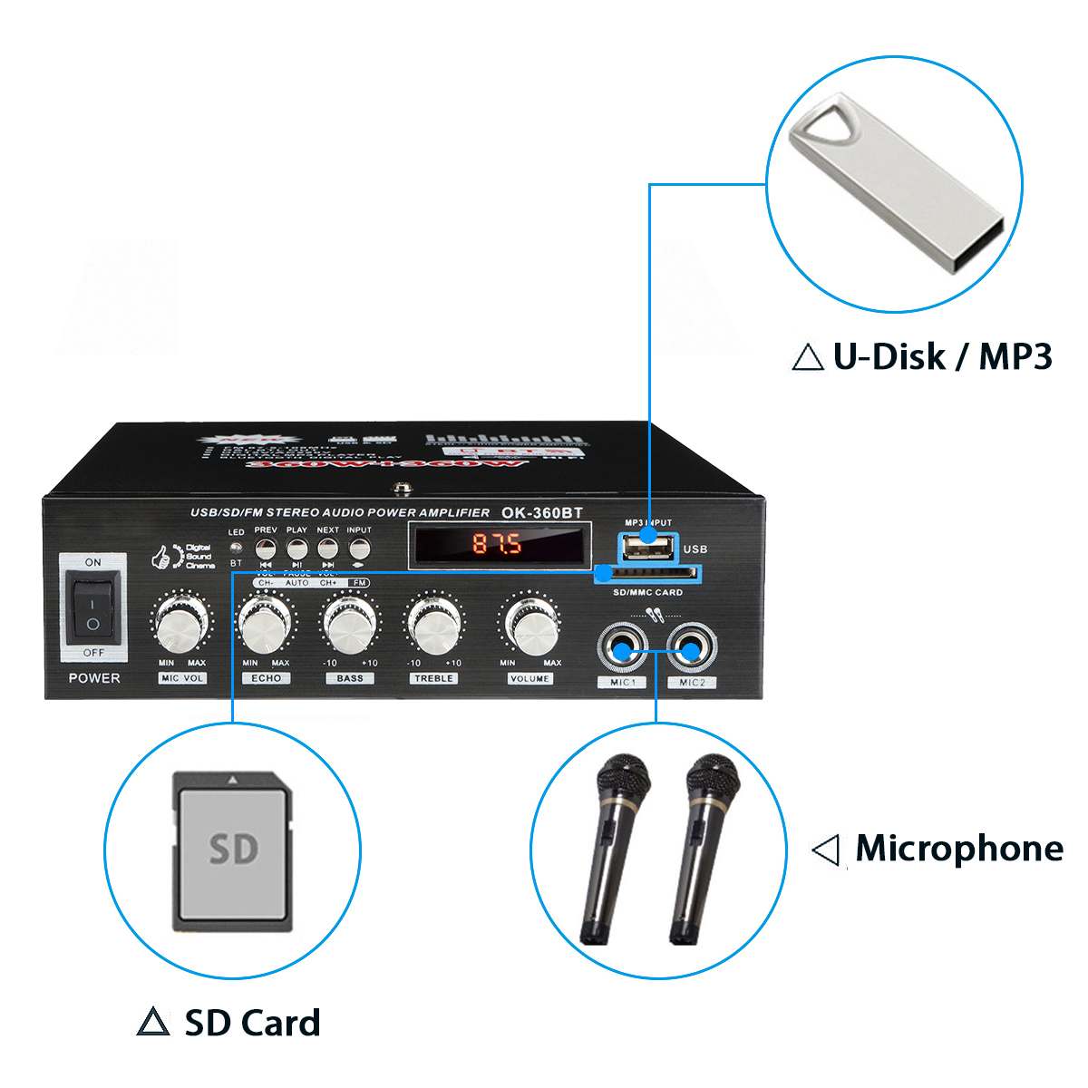 -SD-карта, U-диск, AUX, воспроизведение в формате MP3, поддержка беспроводного подключения Bluetooth.