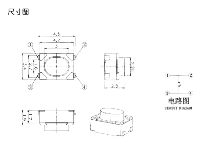 4-контактный сенсорный микропереключатель, кнопочные переключатели 3x4x2,5 мм, 50 шт./лот