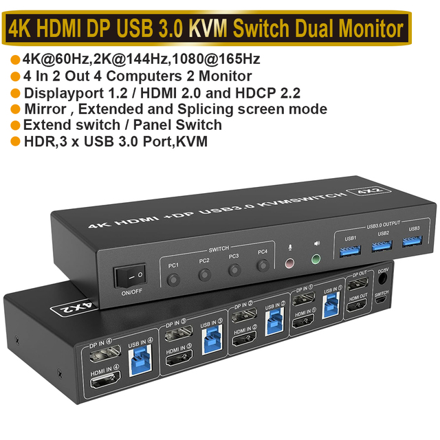 4 порта HDMI KVM USB 3,0 переключатель 4X2 двойной монитор 4K @ 60 Гц Расширенный дисплей DP KVM переключатель 4 в 2 выход для 4 ПК Share клавиатура мышь