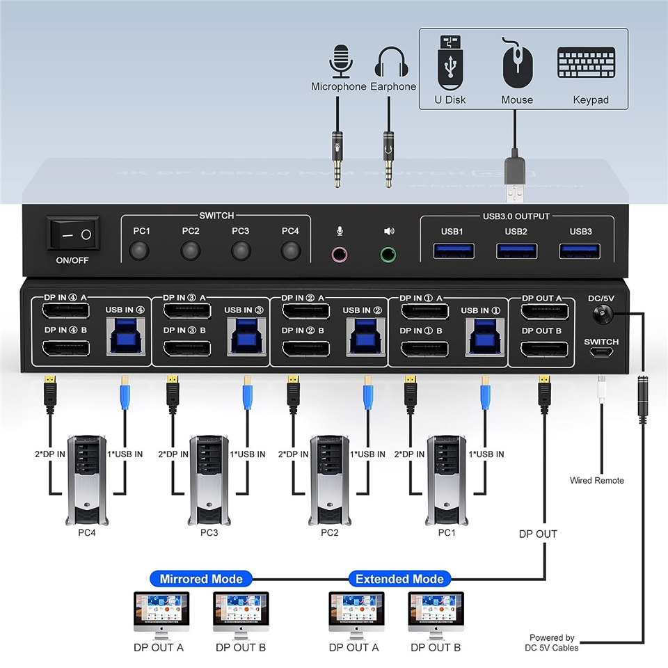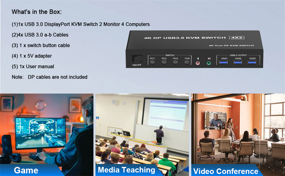 ZY-AD42U,Navceker 4K 60Hz 4x2 Displayport USB 3,0 KVM-переключатель позволяет совместно использовать одну USB-клавиатуру, USB-мышь и два монитора DP для управления 4 компьютерами, ноутбуками и игровыми консолями.