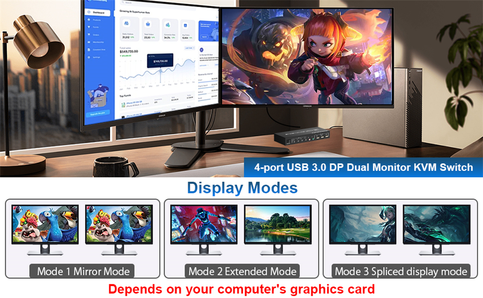 • ★【USB 3,0 KVM-переключатель с двумя мониторами DisplayPort 4 порта】 Этот двойной монитор 4 IN 2 OUT DP KVM-переключатель предназначен для управления ими с помощью одного набора клавиатуры, мышь и один или два монитора, чтобы сделать ваше рабочее пространство аккуратным и эффективным, а также отличный выбор для работы из дома. Только когда ваш компьютер поддерживает два или несколько дисплеев, вы можете использовать этот KVM для совместного использования 4 ПК для 2 мониторов. (Расширенные, зеркальные или Сращенные режимы отображения зависят от видеокарты вашего компьютера).