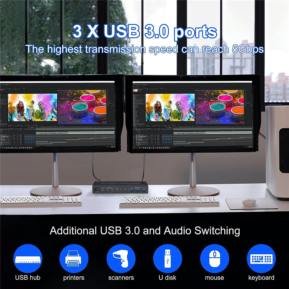 • ★【KVM-переключатели DP с 3 портами USB 3,0 】 Двойной монитор Displayport KVM-переключатель с 3 портами USB 3.0, который может распознавать клавиатуру, мышь, принтер, сканер и другие USB-устройства. USB 3,0 обеспечивает скорость передачи данных до 5 Гбит/с, в то время как USB 2,0 обеспечивает скорость передачи данных всего 480 Мбит/с.