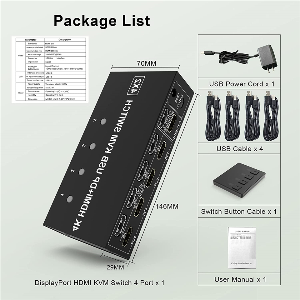 • ✅【Пакет и гарантия】 1x переключатель KVM с двумя мониторами HDMI + DisplayPort, 4x USB-кабеля, 1x Шнур питания USB, 1x проводной кнопочный переключатель, 1x Руководство пользователя; мы предоставляем 18 месяцев гарантии на этот переключатель KVM с двумя мониторами HDMI + DisplayPort. Любая проблема, пожалуйста, свяжитесь с нами, чтобы решить. Спасибо! (Подсказки: Переключение горячих клавиш не поддерживается)