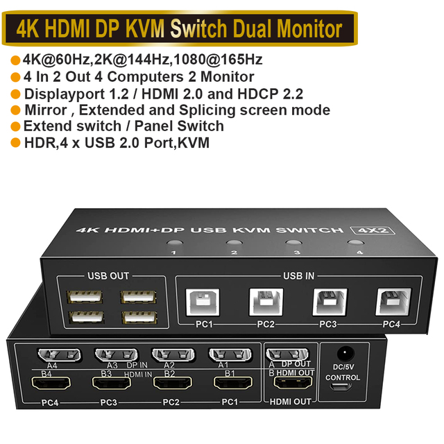 4-портовый HDMI KVM переключатель 4X2 двойной монитор 4K @ 60Гц