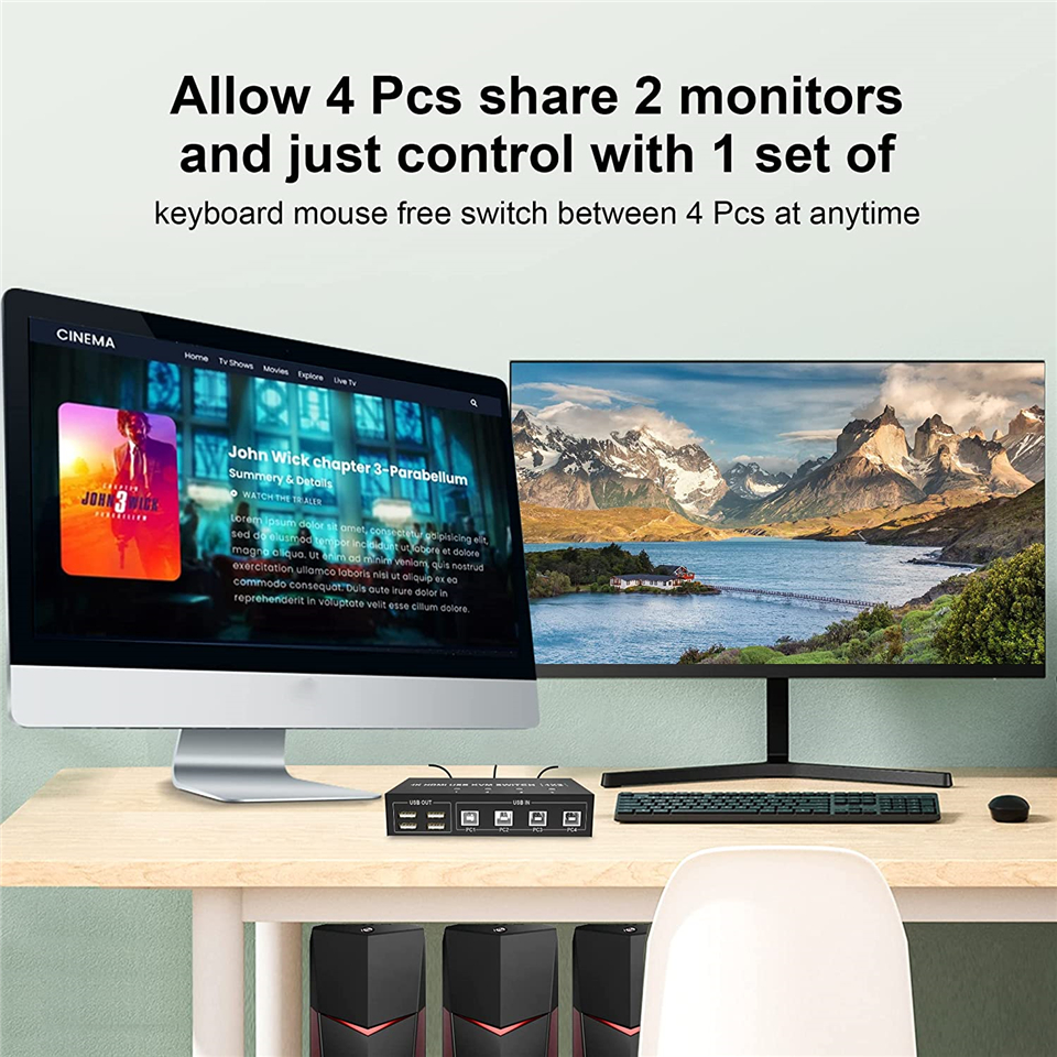 • Этот переключатель KVM с двумя мониторами HDMI + DisplayPort на 4 порта поможет вам управлять 4 совместно работающими 2 мониторами (расширенный режим отображения или режим копирования отображения) только одним набором USB-клавиатуры и мыши.