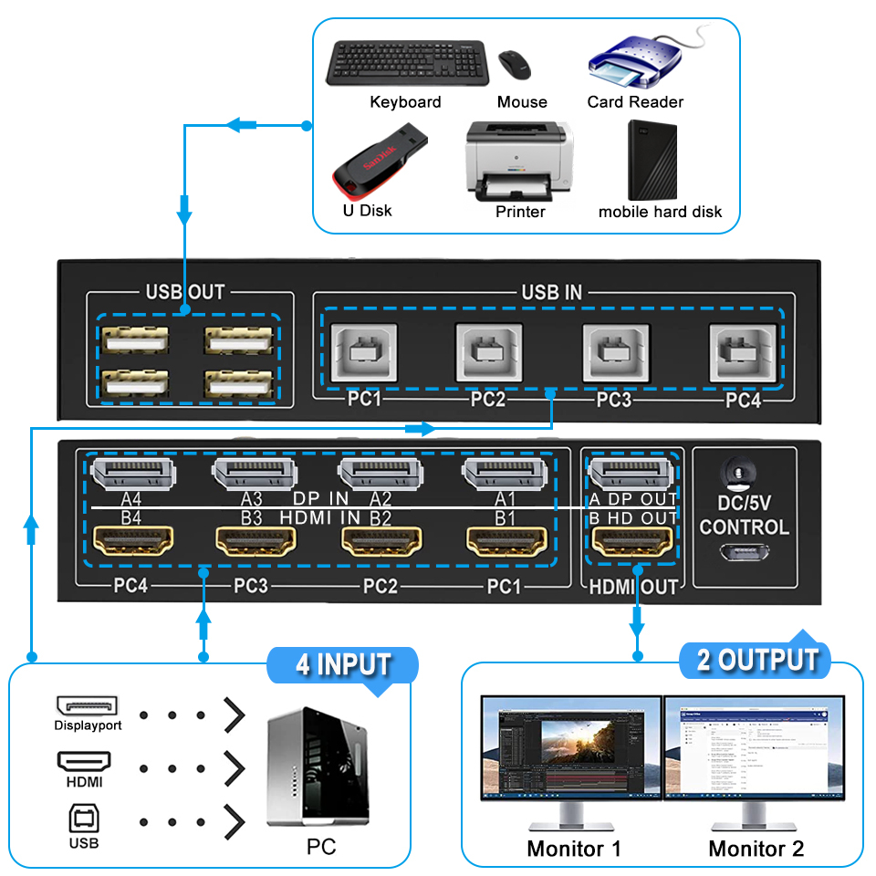 (2) синий цвет ZY-AH42D,DP 1,2/HDMI 2,0 и HDCP 2,2, 4K @ 60Hz 4 порта 4 в 2 выхода HDMI + DP KVM USB 2,0 переключатель двойной монитор, поддержка RGB/YUV 4:4:4, Поддержка режима сращивания экрана, зеркального и расширенного режима, поддержка однокнопочного переключателя и дополнительного удлинительного переключателя, Не поддерживает переключатель горячих клавиш.