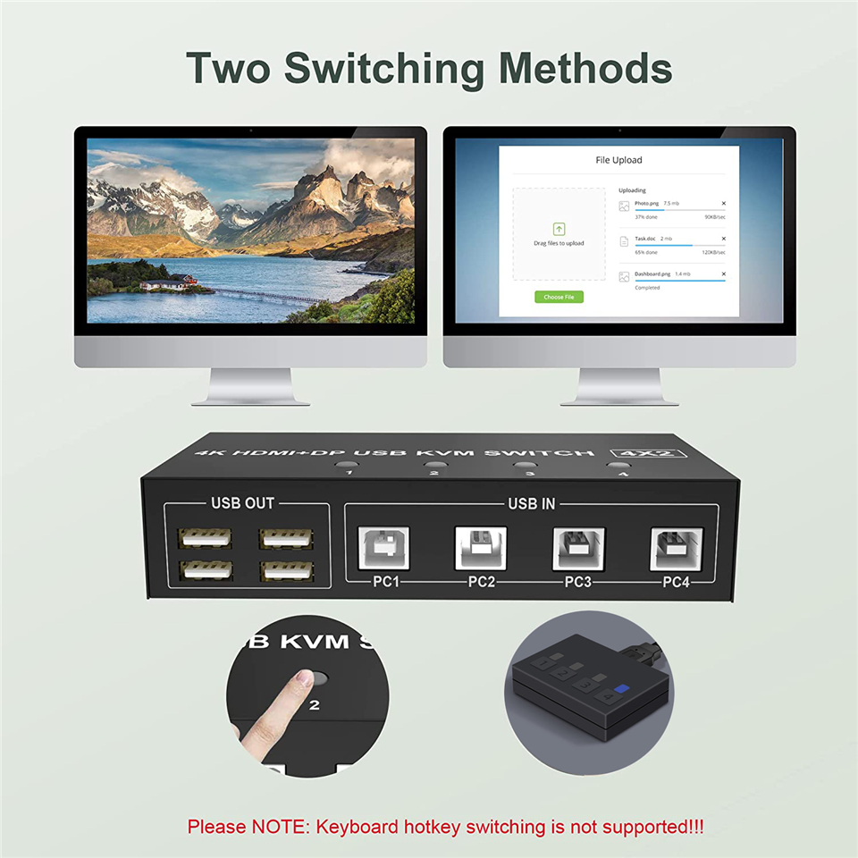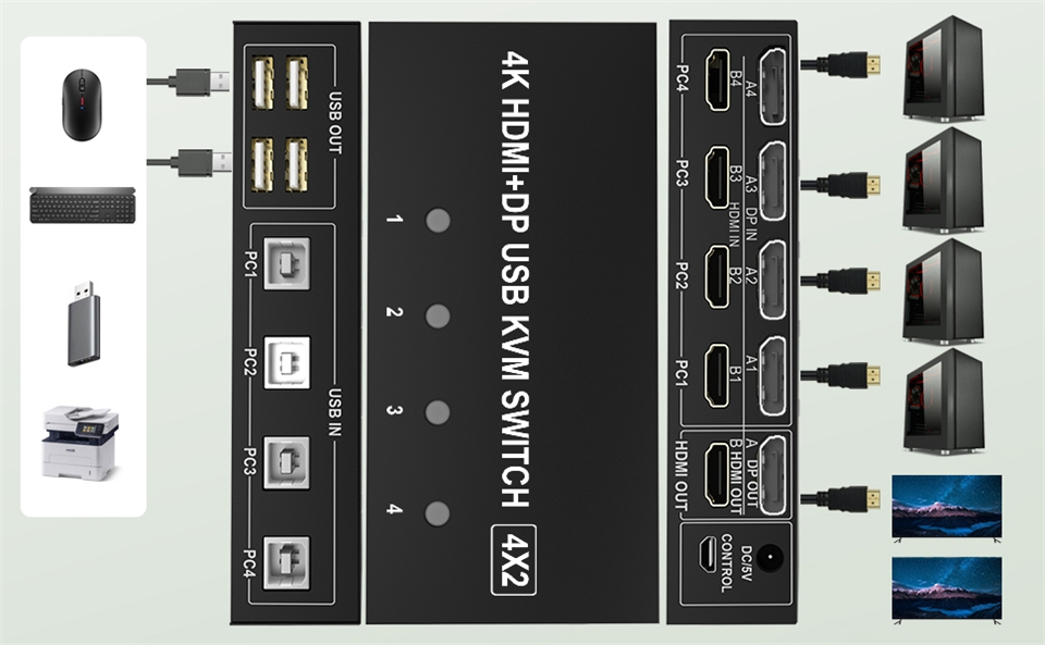 ZY-AH42D,Navceker 4K 60Hz 4x2 HDMI Displayport USB KVM-переключатель позволяет совместно использовать одну USB-клавиатуру, USB-мышь, один монитор HDMI и один монитор DP для управления 4 компьютерами, ноутбуки, игровые консоли.