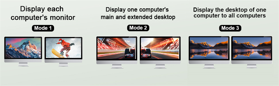 • ✅【Переключатель KVM с двумя мониторами HDMI + DisplayPort 3 режима】 Переключатель KVM с двумя мониторами HDMI + DisplayPort 4 порта с 3 режимами отображения. Режим 1: Сращивание двух мониторов для отображения изображения одного хоста; Режим 2: Два монитора показывают главный экран и расширенный один хост; Режим 3: два монитора соответственно показывают рабочие столы двух хостов. (Примечание: 3 режима необходимо настроить вручную в настройках системного дисплея)