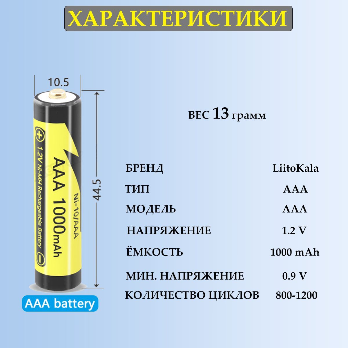 Описание: Аккумуляторные батарейки LiitoKala 1000mAh AAA - никель-металлогидридные аккумуляторы характеризуются большим сроком службы, стабильной работой в широком диапазоне температур, и большой емкостью в 1000 мАч. Аккумуляторы хорошо работают с любым устройствами, требующими большого количества энергии: игровые мини-приставки, плейеры, ПДУ, фонарики, часы, компьютерные мышки и т. д.