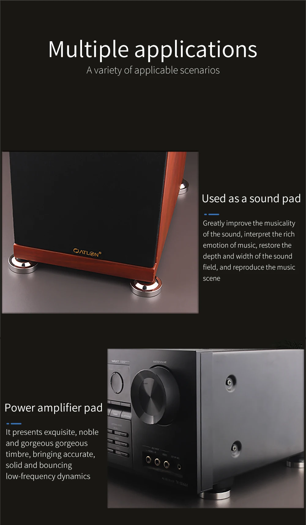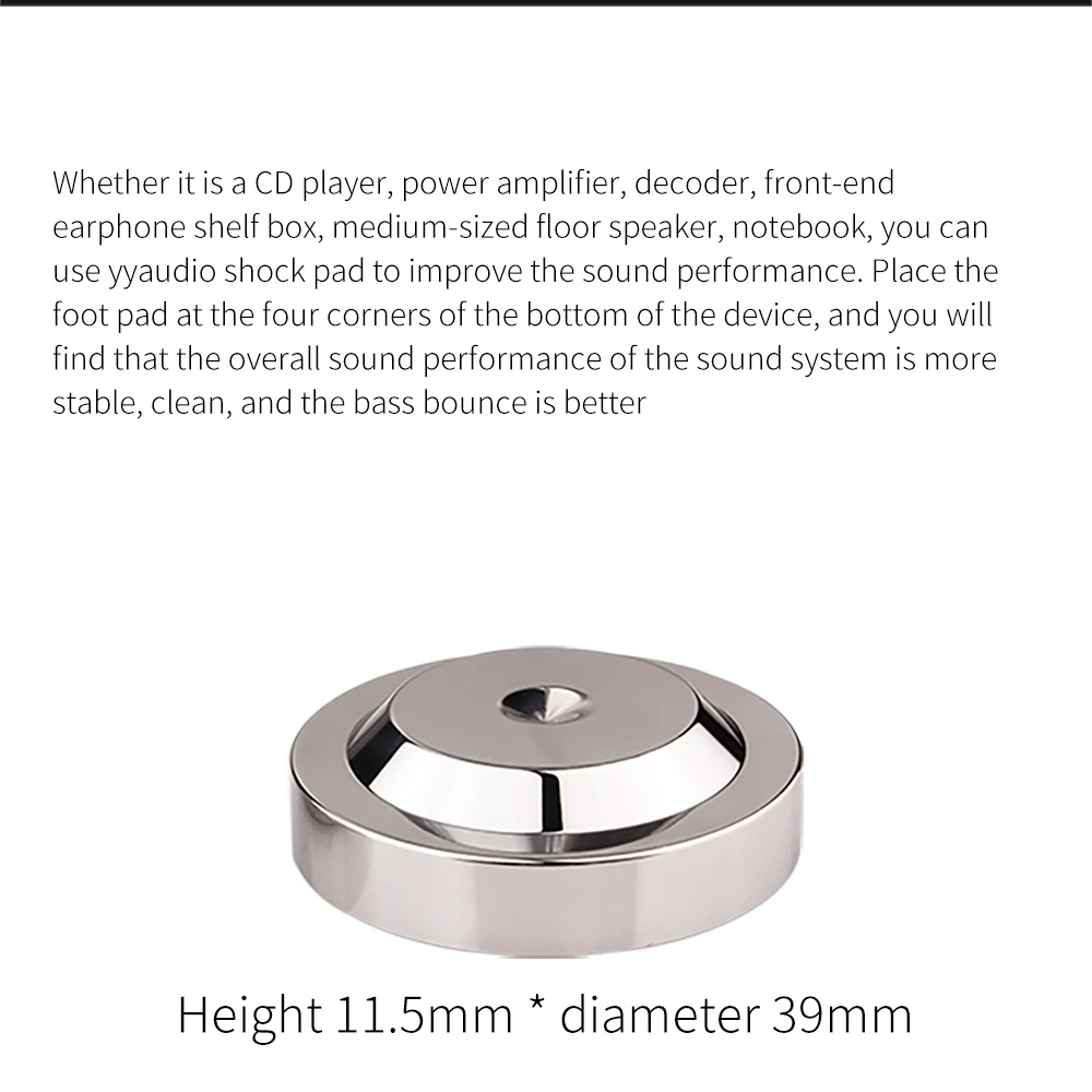 4. Будь то CD проигрыватель, усилитель мощности, декодер, фронтальная полка для наушников, напольный динамик среднего размера, ноутбук, вы можете использовать yyaudio shock pad для улучшения звуковой производительности. Поместите подушечку на четыре угла нижней части устройства, И вы есть что общее звучание производительность звуковая система morestable, чистый и басы отказов лучше Высота 11,5 мм * диаметр 39 мм