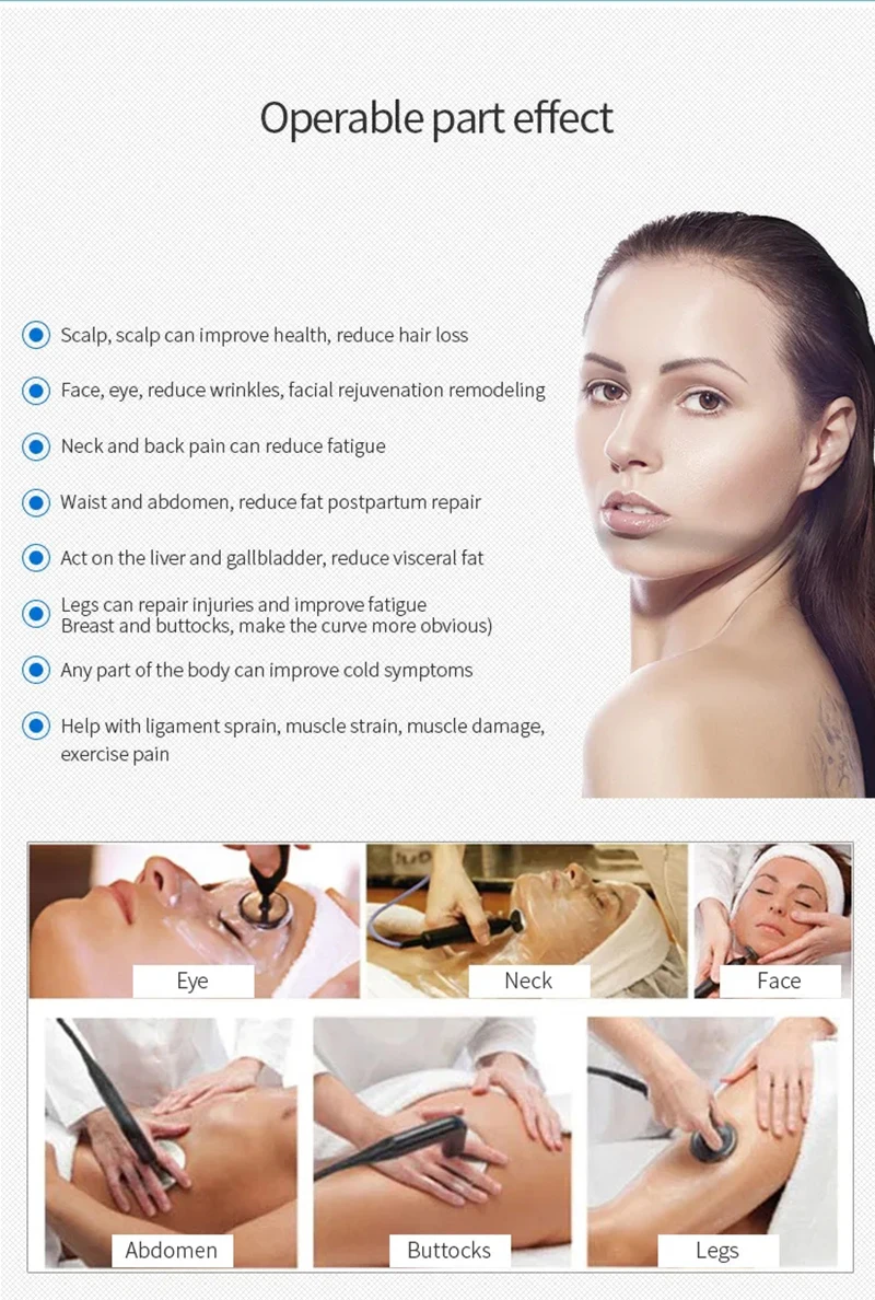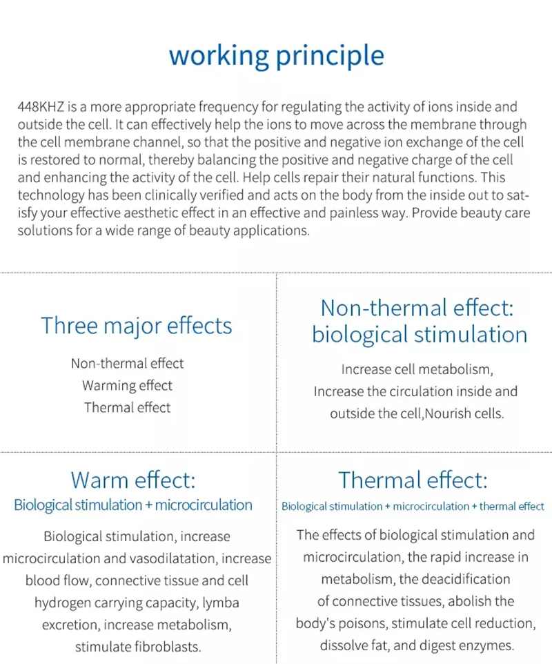Но также улучшает температуру в глубоких частях тела, и температура тела очень тесно связана с вашим здоровьем. Температура вашего тела на 1 градус повышает иммунитет вашего тела в 5-10 раз. 448k термоконтроллер может безопасно доставить энергию в глубокие части тела через высокую еженедельную волну 448 кГц, улучшая внутреннюю температуру и иммунитет тела.