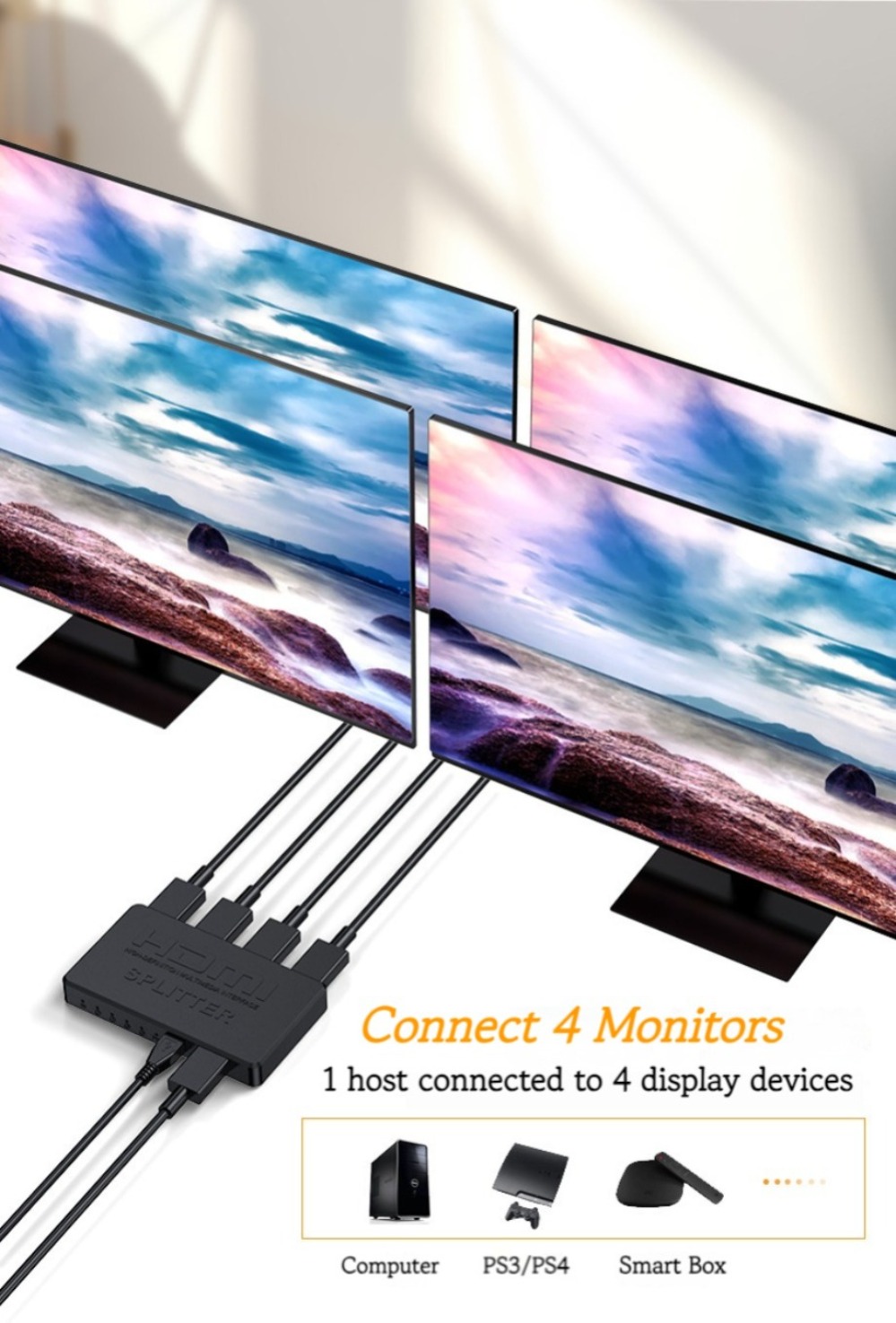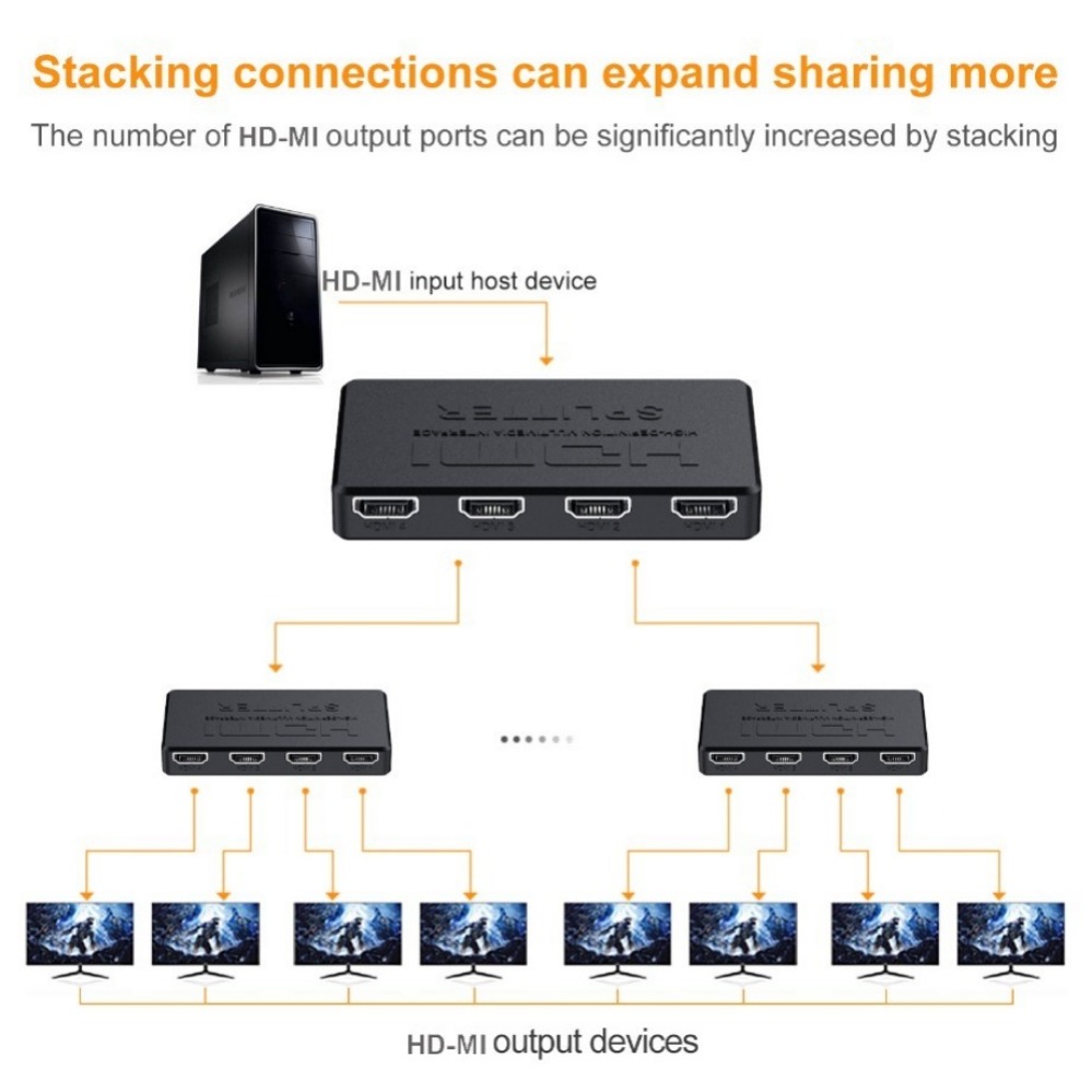 ● HDMI Splitter 1 на 4 выхода, так что порт HDMI для выделения четырех портов HDMI аудио и видео дистрибьютора высокой четкости.