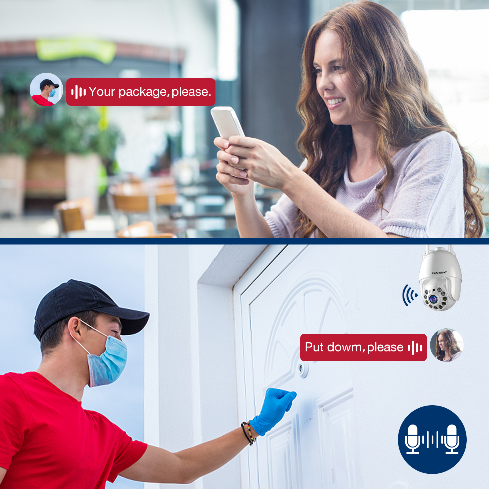 Прожектор можно настроить на включение при обнаружении движущихся объектов в темноте, вы также можете установить звуковой сигнал, чтобы включить громкую сирену при обнаружении движущегося объекта. Встроенный продвинутый микрофон и динамик позволяют отпугнуть незваных гостей, посылать команды своим питомцам, поздороваться с гостями.