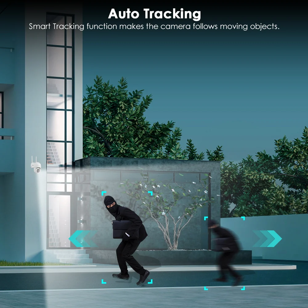 После блокировки цели камера автоматически регулирует вращение панорамирования, отслеживая движущиеся объекты, автомобили, домашних животных, человека и уведомления push-оповещений на ваш смартфон