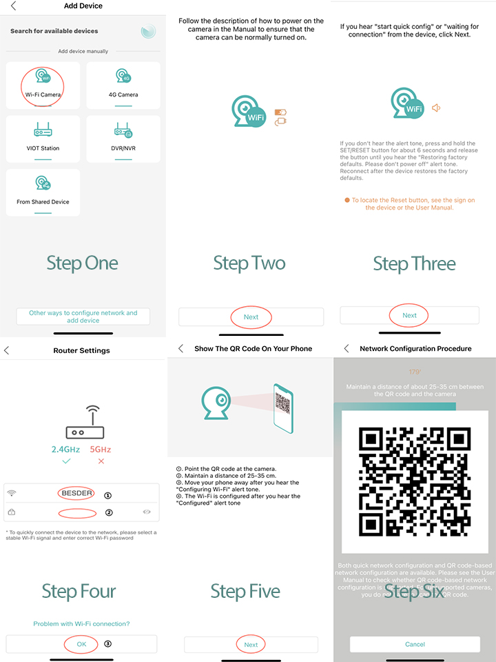 ③ Подключите камеру через сетевой диапазон Wi-Fi 2,4 ГГц, выполните 6 шагов на картинке, чтобы подключиться, и вы можете успешно настроить ее.
