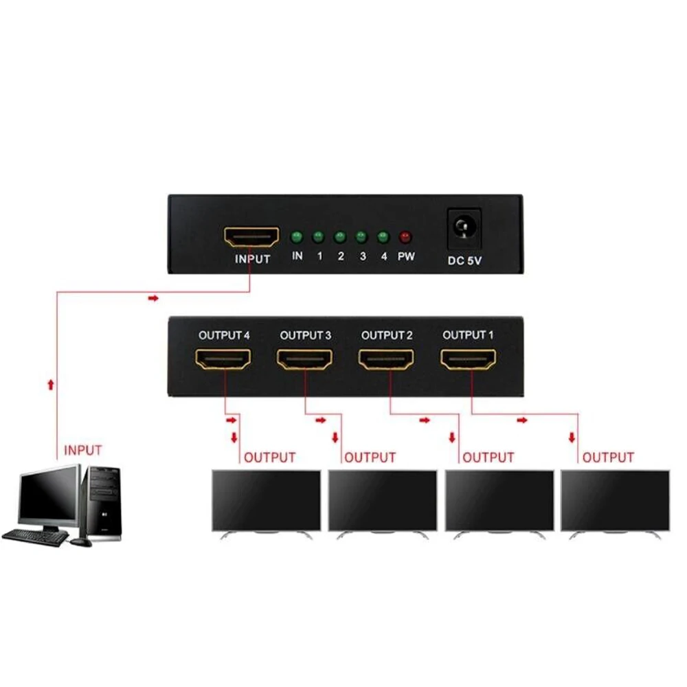 1. Введите 4 выхода и скопируйте сигнал на 4 hdmi-совместимых выходных устройства.