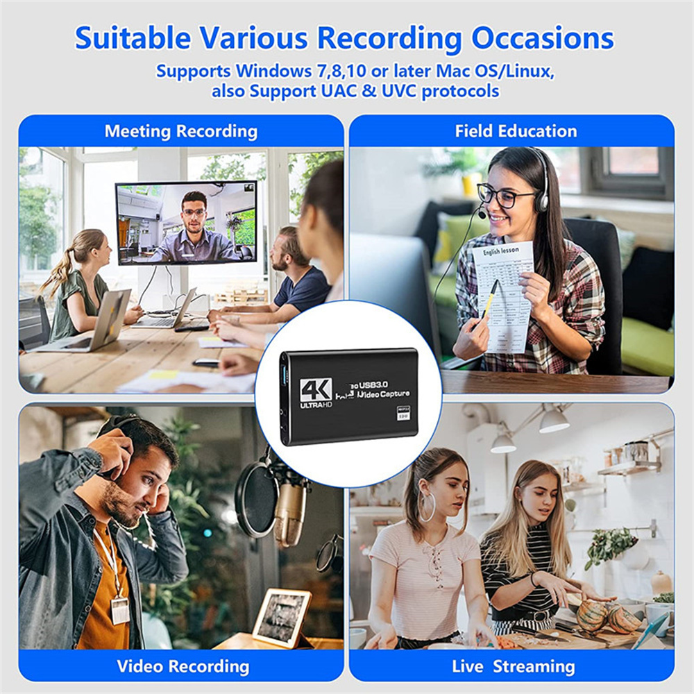 [Введение в продукт] Карта видеозахвата 4K HD на USB3.0, удобство переноски, Превосходная производительность, хорошая совместимость, простая установка, мощные функции и т. Д., Может собирать 1 входной сигнал HD; совместимость с Windows 7, 8, 8,1, 10 или новее, ОС Linux, интерфейсом Mac OS USB3.0, Совместимость с несколькими наборами микросхем USB3.0 (Intel, Renesas, ASMedia, Fresco Logic), обратная совместимость с USB2.0, подключение к ПК или мобильному телефону через интерфейс USB3.0 Благодаря множеству бесплатных сторонних программ для воспроизведения и сбора данных, для предварительного просмотра, записи, приобретения, прямой трансляции и других функций, Получение HD-видео соответствует стандартам UVC и UAC, проста в использовании.