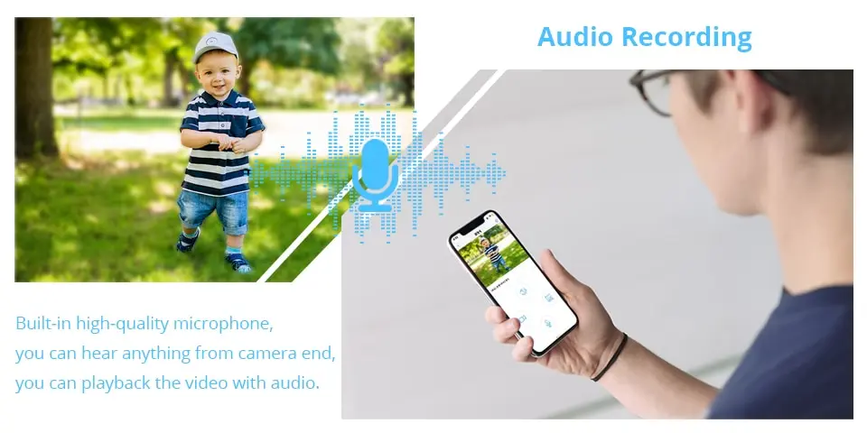 • Двустороннее аудио- :Общайтесь с кем угодно на другом конце камеры с помощью функции двусторонней аудиосвязи, позволяющей вести Простые и удобные разговоры.