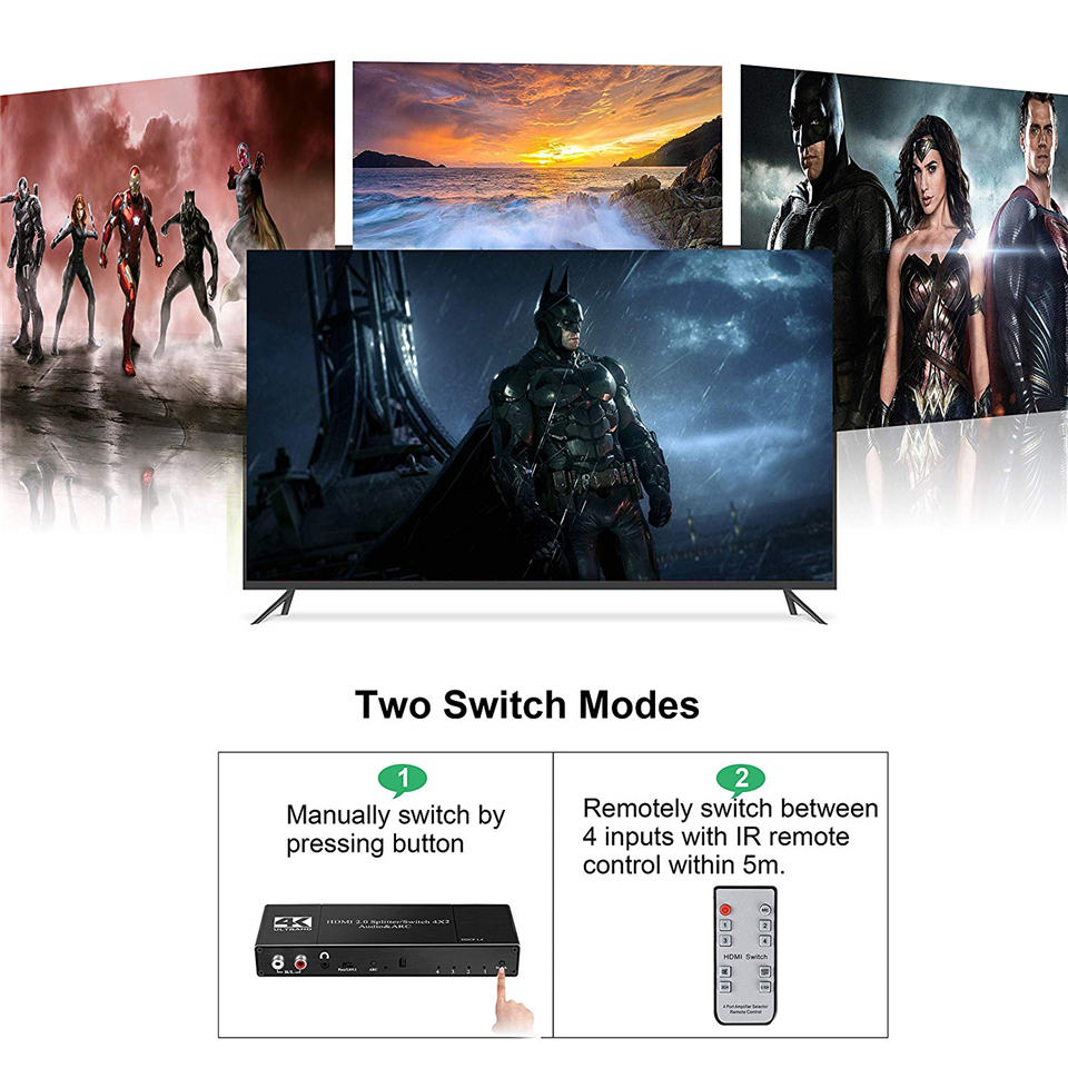 (3) Белый цвет ZY-HS402,HDMI 2.0b и HDCP 2,2, 4K @ 60Hz 4X2 HDMI Switch аудиоэкстрактор с ARC, разъемом 3,5 мм, L/R, коаксиальным и оптическим Toslink SPDIF. Поддержка RGB 4:4:4 для 4K @ 60 Гц, EDID, ИК-пульт дистанционного управления, HDR 10.