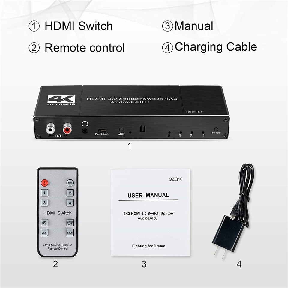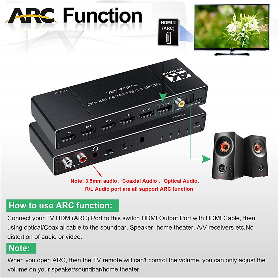 4x2 4K HDMI переключатель аудио экстрактор ARC & оптический Toslink 4 в 2 выходной переключатель HDMI 4K 60 Гц HDMI