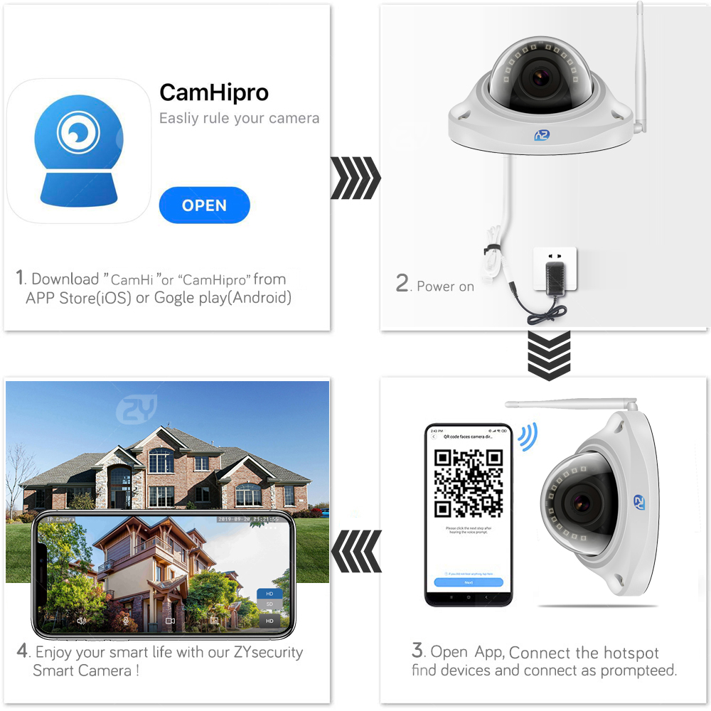 IP-камера ZYsecurity поставляется с QR-кодом, который можно сканировать с помощью мобильного устройства с помощью нашего бесплатного приложения (iOs и Android). Эту беспроводную камеру можно быстро и легко настроить.