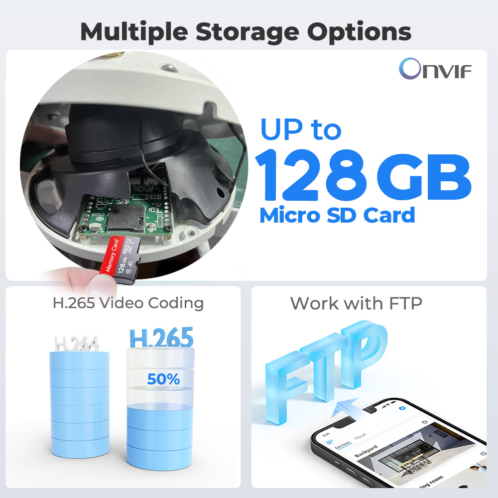 Встроенный локальный слот для карт TF (8- 128G), поддержка протокола Onvif. Работа с FTP.
