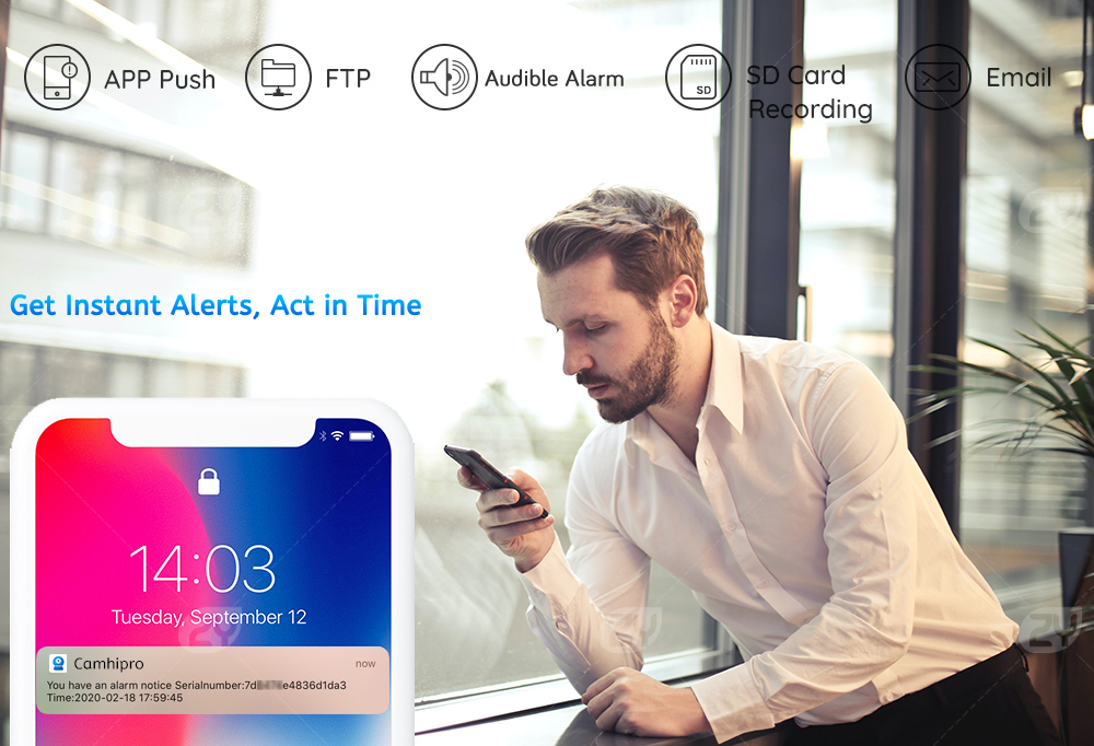 Once an intruder is detected, the camera’s siren will be triggered or manually activated to warn off the would-be criminal. Stop the crime before it happens. and the alerts message will send to your mobile phone.