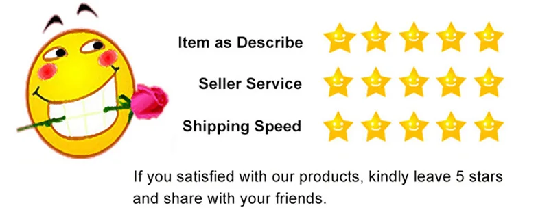 Пожалуйста, оставьте положительный отзывы 5 звезд, если вы удовлетворены нашей продукцией и обслуживанием. Ваше удовлетворение и положительные отзывы действительно очень важны, если у вас есть какие-либо проблемы с нашими товарами или обслуживанием, пожалуйста, не стесняйтесь связаться с нами, прежде чем оставить отрицательный отзывы. Мы сделаем все возможное, чтобы решить любые проблемы и предоставить Вам лучшее обслуживание клиентов.