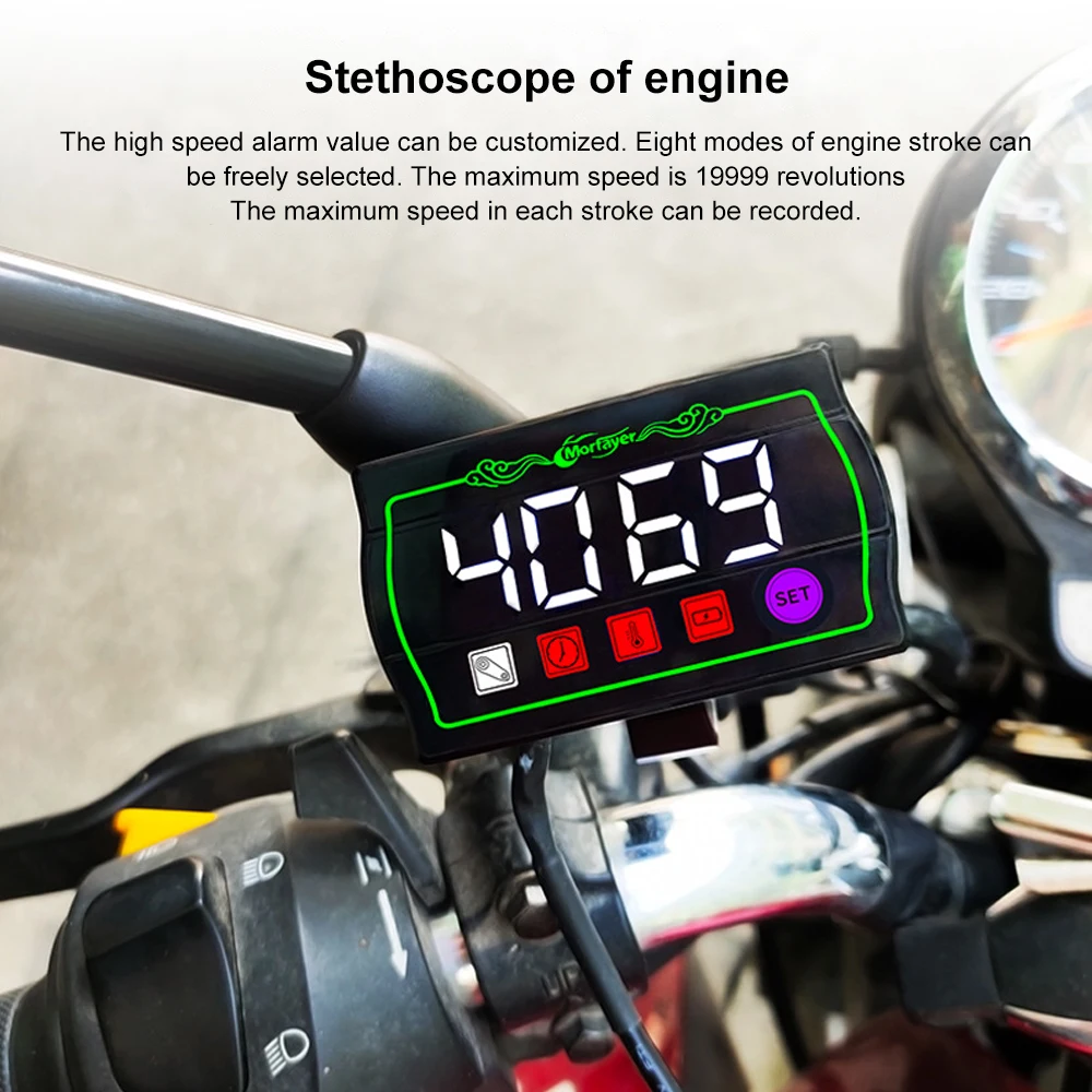RPM: настраиваемая конструкция с высоким значением сигнала тревоги об/мин, с бесплатным выбором восьми режимов хода двигателя, с максимальным объемом оборотов в минуту 19999, и с возможностью записи самых высоких оборотов в минуту в каждом такте.