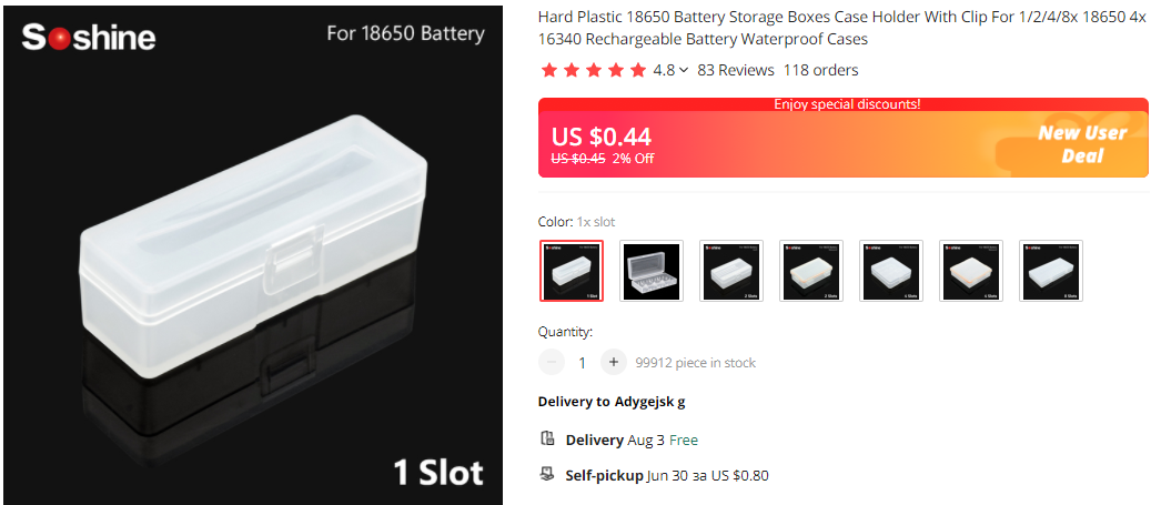 Подходит для литий-ионных аккумуляторов 2/4x18650 (Не прилагаются).