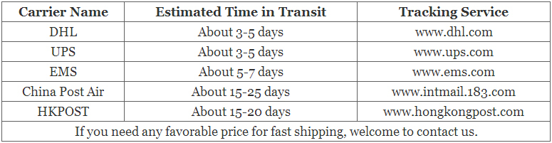 4.Обычно посылки отправляются авиа-отправление Почты Китая, что занимает 15-25 рабочих дней в зависимости от страны, погодных условий, праздников и т. д. Если вам нужны товары в спешке, пожалуйста, свяжитесь с нами для другого способа доставки (как показано ниже), который требует дополнительной платы.