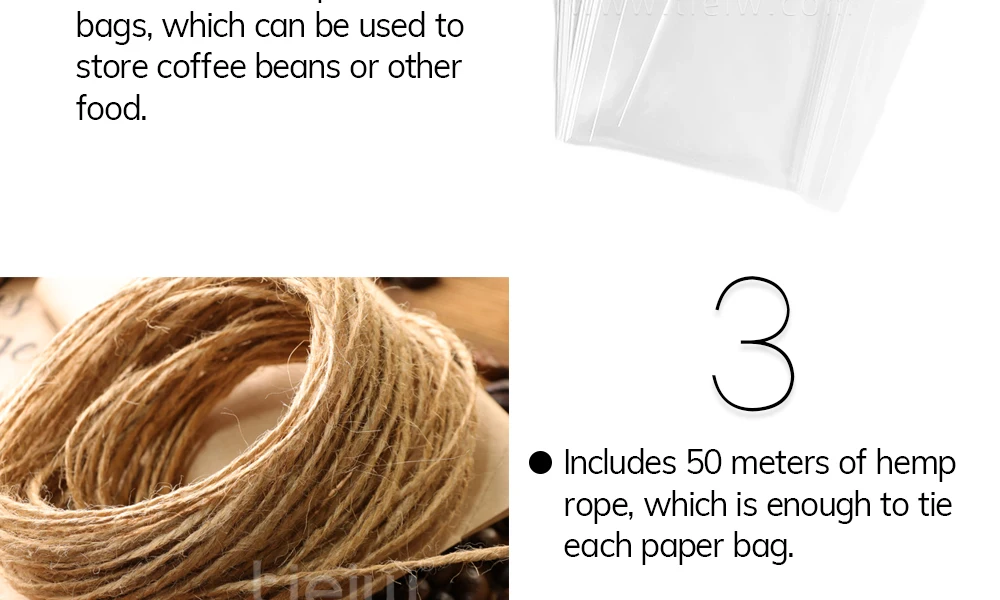 В комплект входит: 50 бумажных пакетов по индивидуальному заказу, 50 пакетов OPP, 50 метров пеньковой веревки.