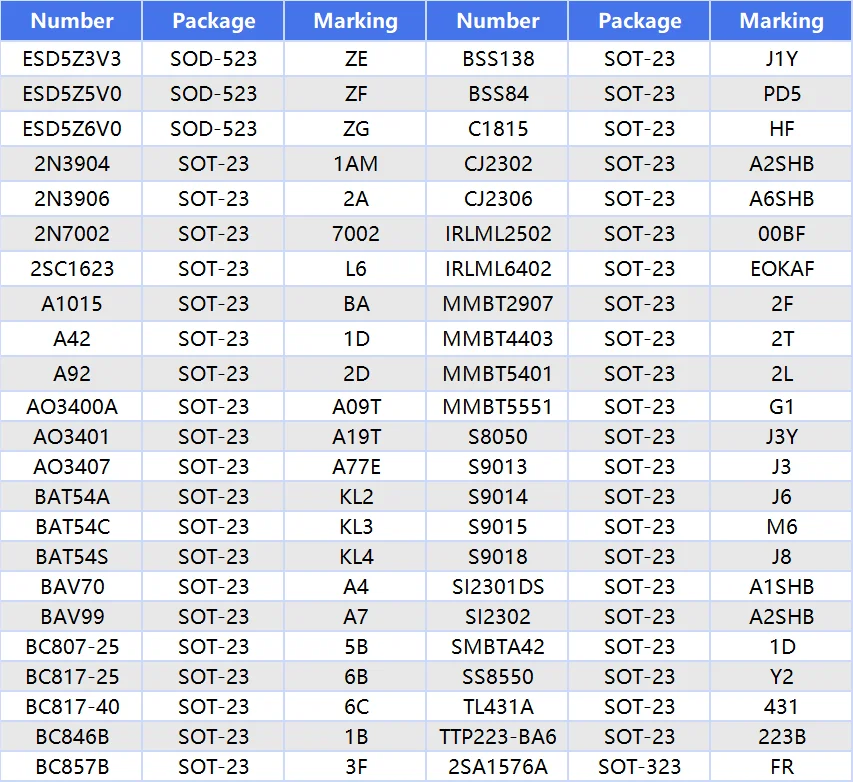 Номер модели TL431A S8050 2N3904 2N7002 BSS138 2SC1815