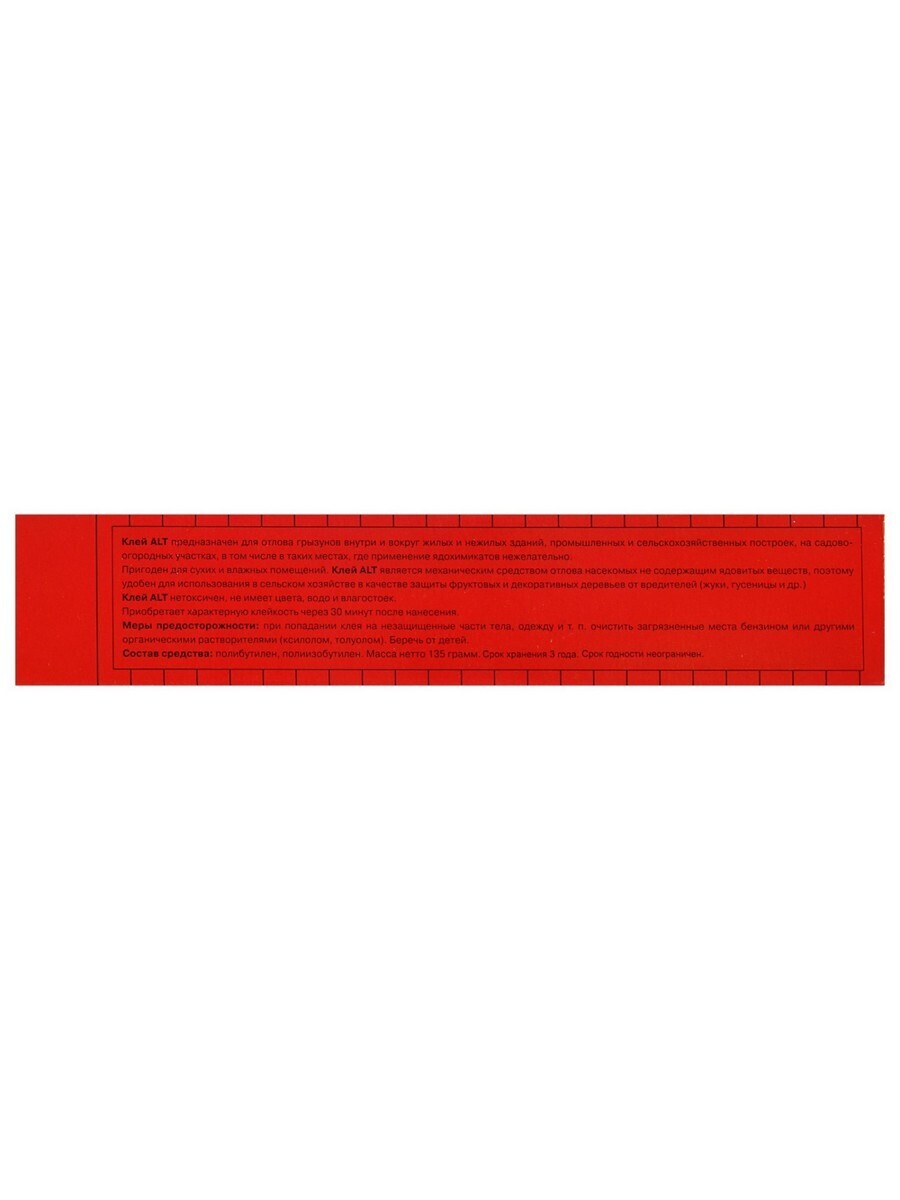 Основные компоненты клея ALT – полимеры бутилена, безопасные для человека. Не вызывает раздражения кожи и слизистых оболочек. Рекомендован к использованию на промышленных предприятиях, в сельском хозяйстве, в заведениях общественного питания и др. Высокая эффективность и безопасность позволяют использовать клей ALT там, где нет возможности применять ядохимикаты. Препарат также подходит для бытовой борьбы с вредителями.