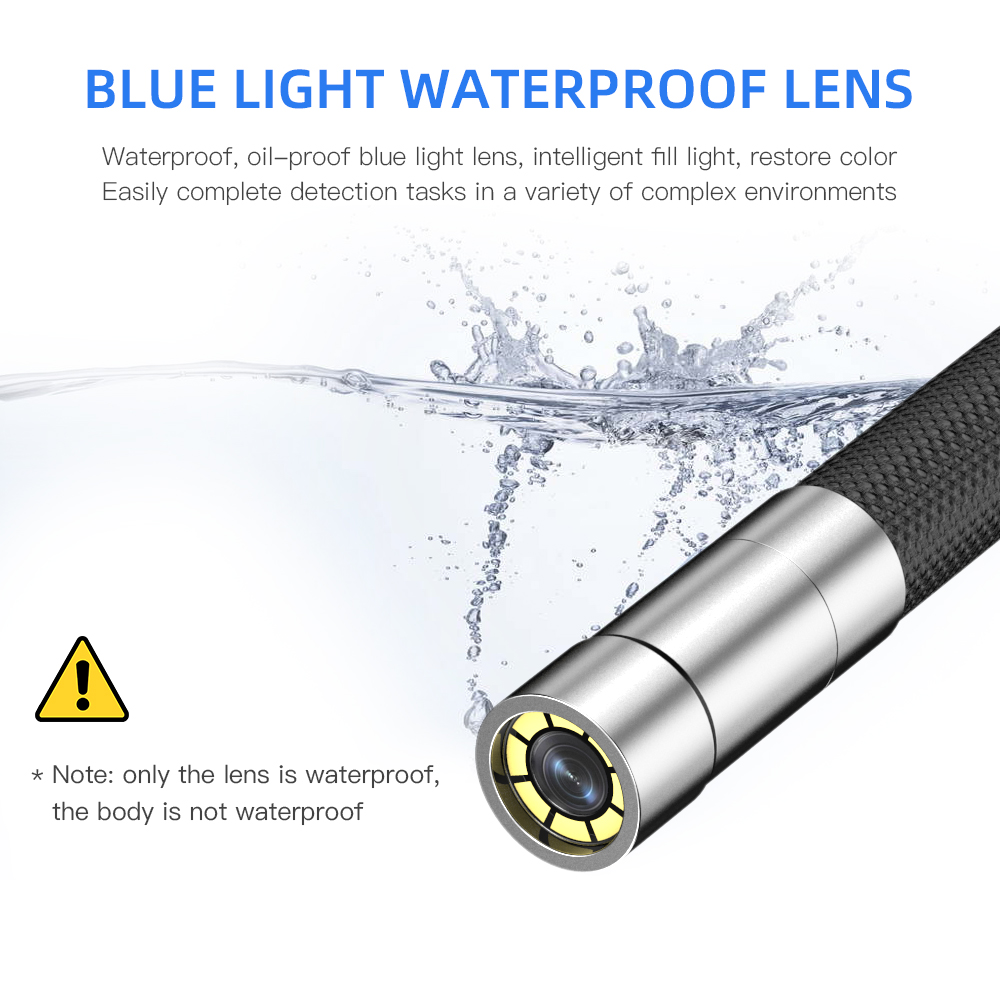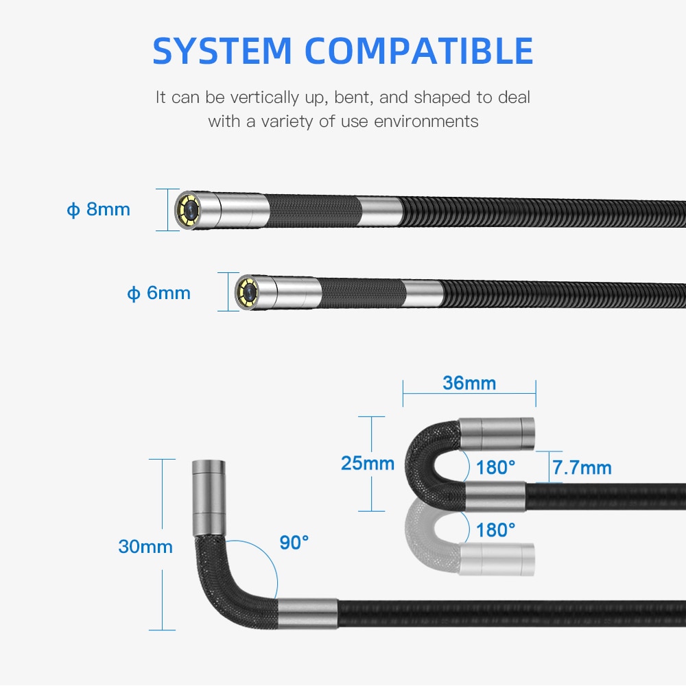 3. Ультратонкий зонд диаметром 8 мм/6 мм: водонепроницаемая конструкция IP67 позволяет камере работать под водой 3,5 фута (1 метр). Может поворачиваться на 180 градусов для неразрушающего контроля труднодоступных мест, таких как сливы, канализационные трубы, выхлопные отверстия, воздуховоды, печи, двигатели.
