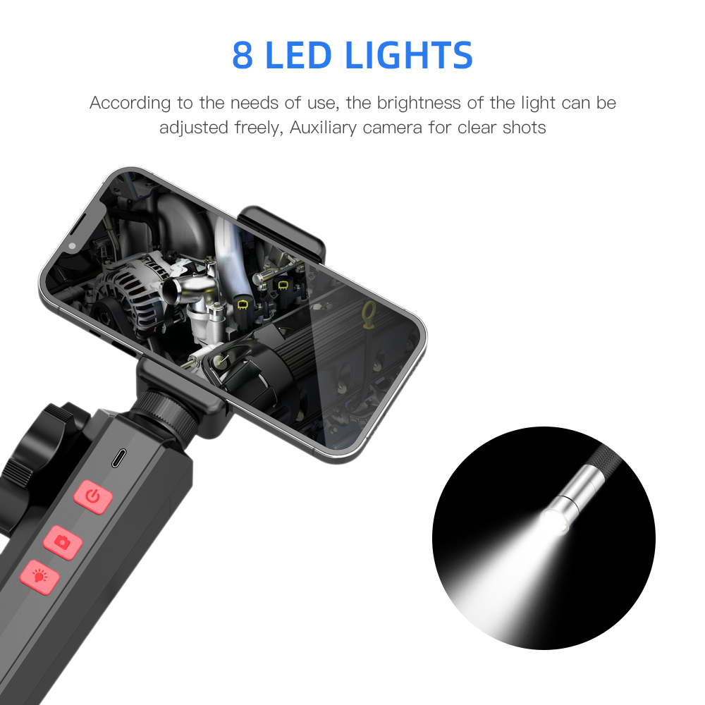 4. Встроенный 8 регулируемых светодиодный света: объектив оснащен 2 миллионами пикселей высокой четкости, макро объектив крупным планом отображает изображения с высоким разрешением в реальном времени, плюс 8 регулируемых светодиодный ламп, которые могут адаптироваться к различным условиям эксплуатации, чтобы увидеть в самых темных пространствах.