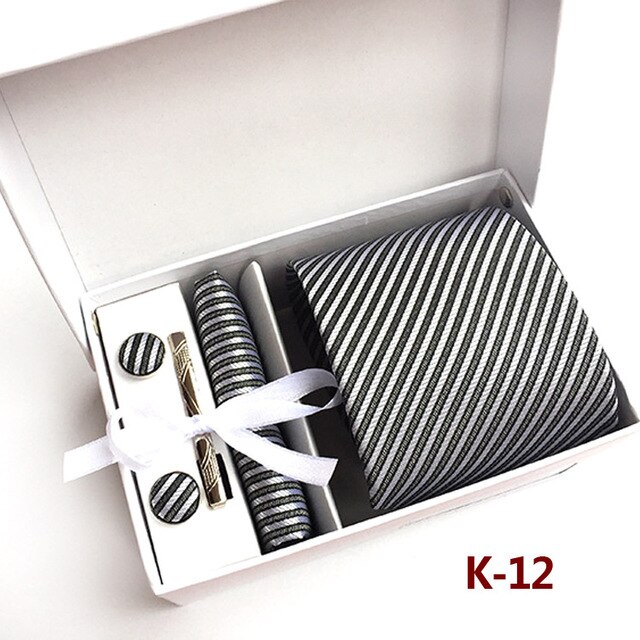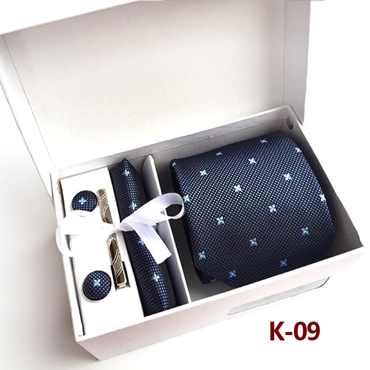 В комплект входят галстук, шарф, запонки, зажим для галстука, белая коробка.