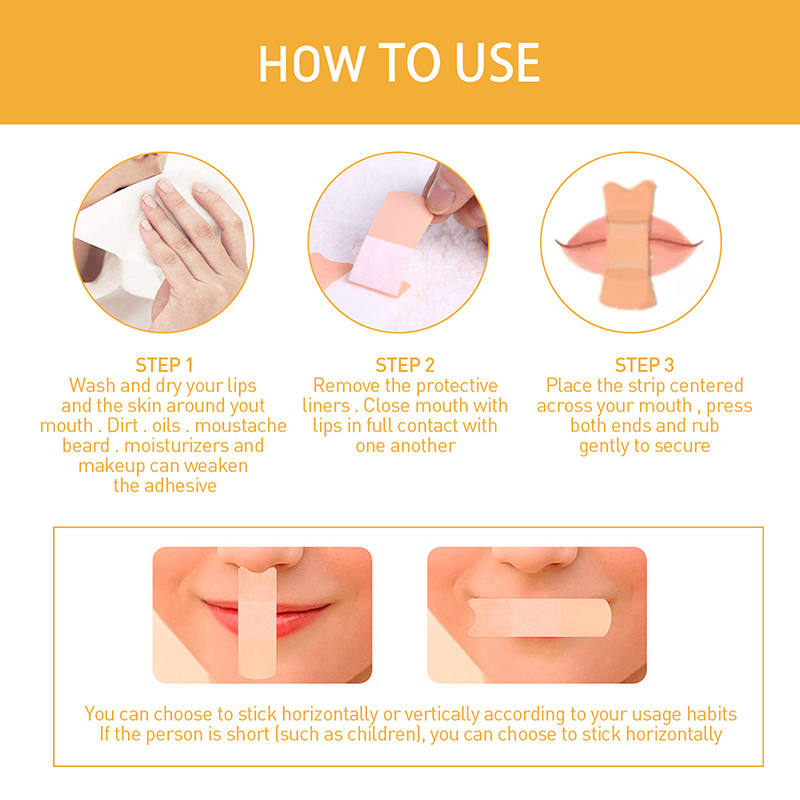 2. Легко и удобно использовать полоски средней длины, закрывают губы и приклеивают ленту между губами. Чтобы лента плотно прилегала, не наносите крем, лосьон или помаду вокруг приклеенных губ.