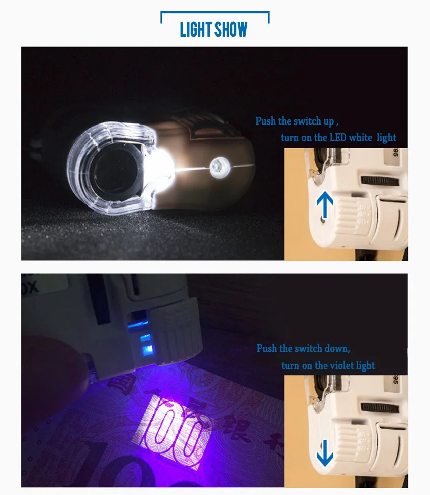 • Включает в себя специальный УФ-светодиодный светильник, предназначенный для проверки hallmark и обычной светодиодный светильник, фокусировка регулируется, и переключатель разработан по-Новски.