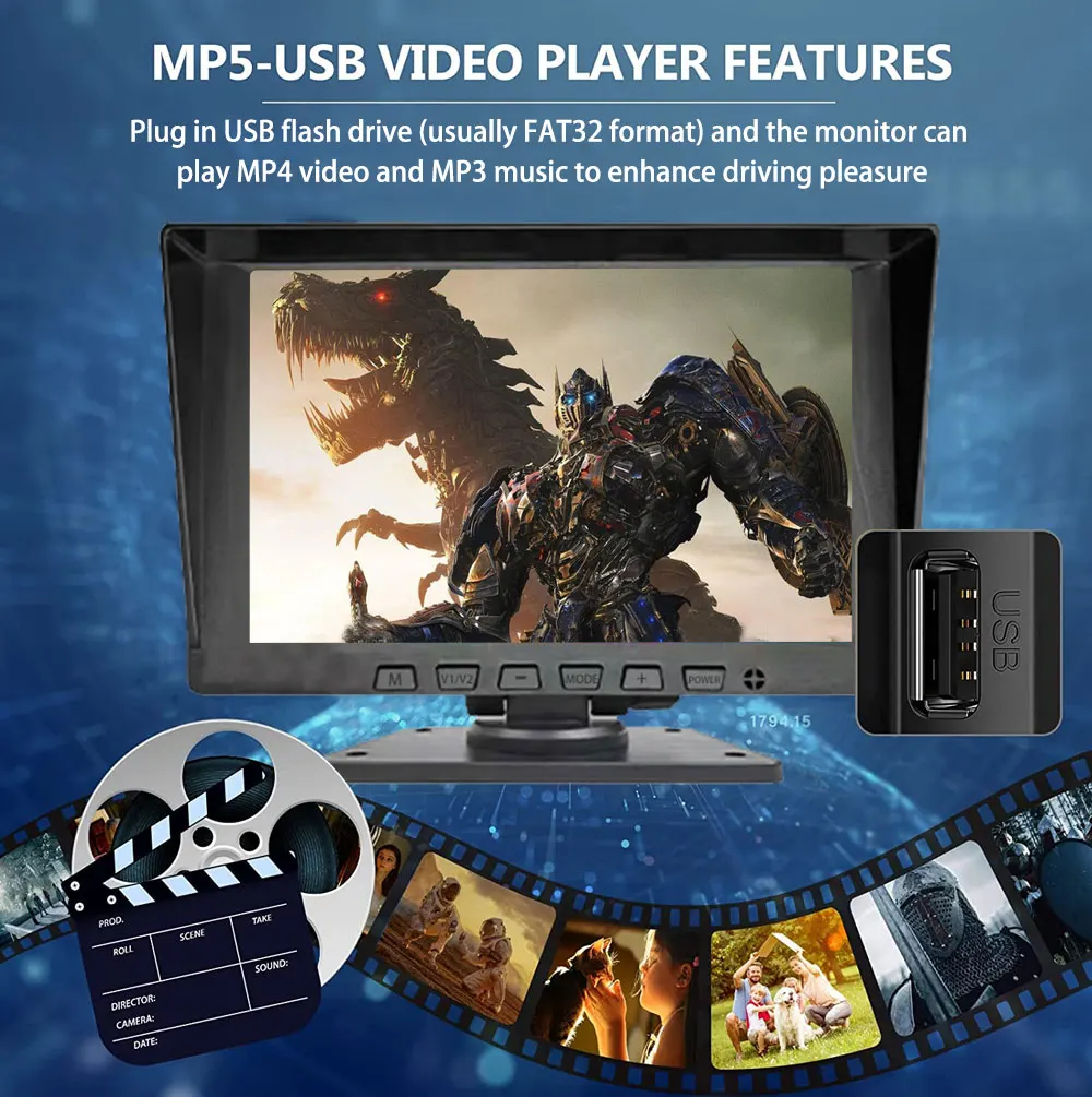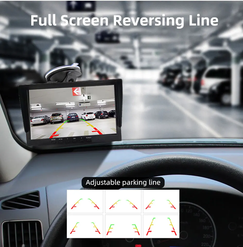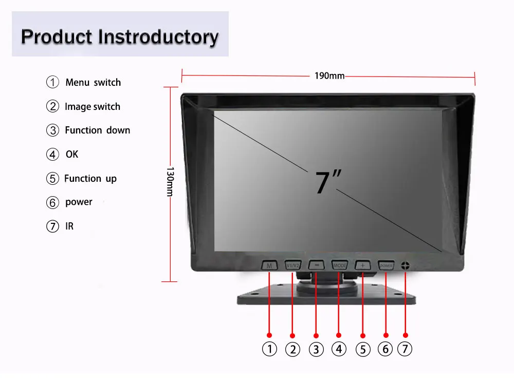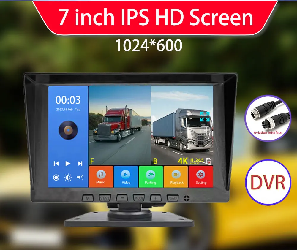 7-дюймовый IPS-экран 1024*600, можно управлять кнопкой или ИК-пультом дистанционного управления. Он покажет вам изображение HD, поможет вам увидеть скрытые места и изображение задним ходом.