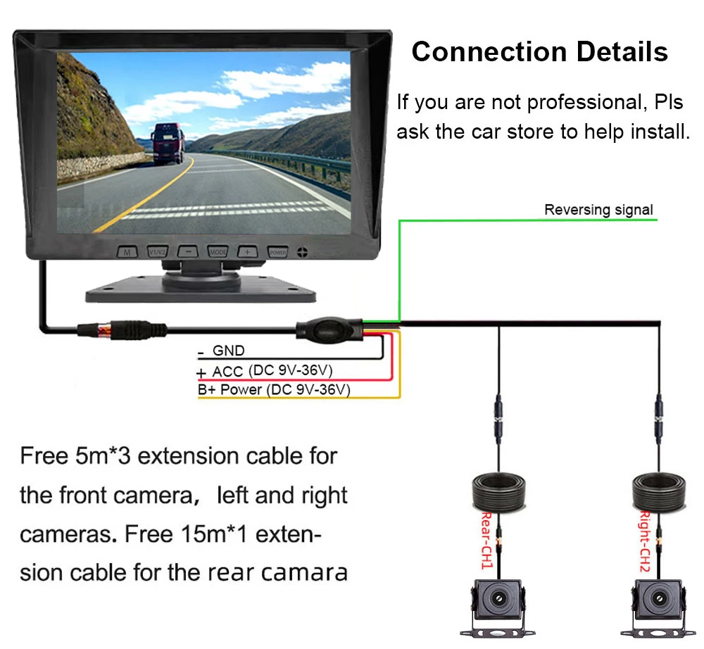 Удлинительный кабель по умолчанию 1 шт. 15 метров для заднего вида, Удлинительный кабель 3 шт. 5 метров для переднего, левого и правого вида. Поддержка настройки кабеля по мере необходимости.