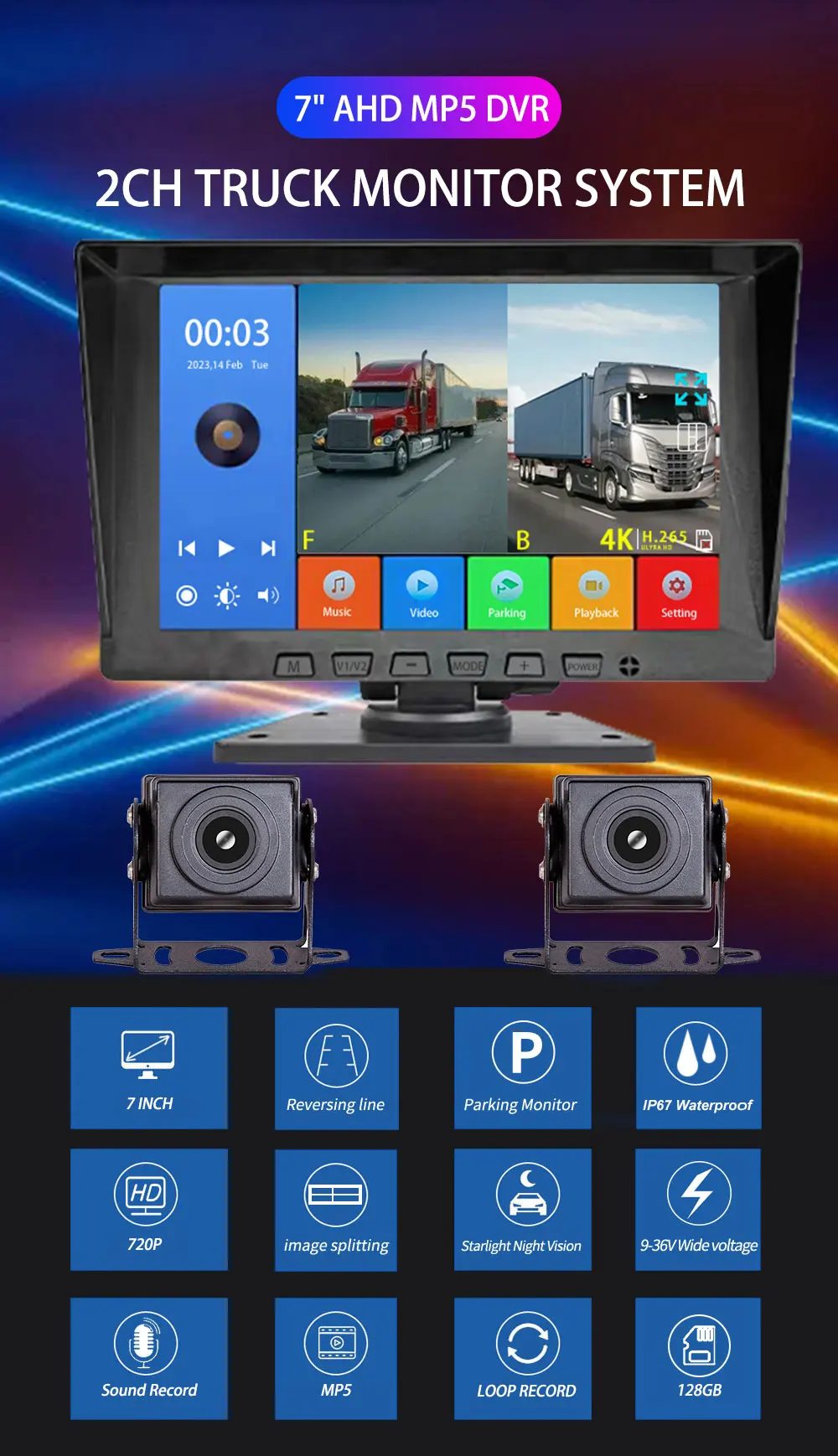 Есть 2-канальная камера 720P AHD для системы автомобильного монитора, по сравнению с беспроводной камерой WIFI, Эта камера имеет большое преимущество, она не будет иметь задержки изображения, очень подходит для вашей безопасности вождения.