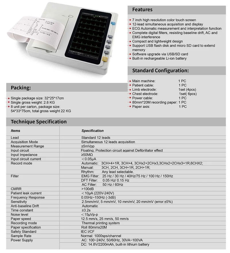 7-дюймовый сенсорный экран ECG301, цифровой 3-канальный 12-контактный электрокардиограф с программным обеспечением для ПК