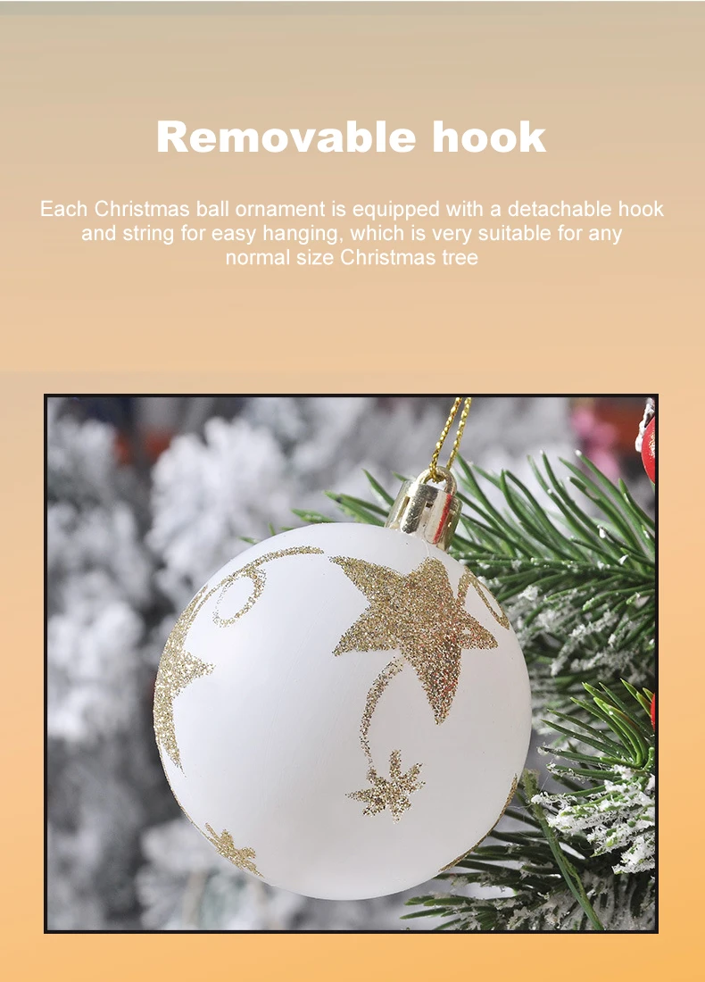 【Quick & Easy to hang】каждое украшение для рождественских шариков оснащено съемным крючком и веревкой для легкой подвешивания, что очень подходит для любой новогодней елки нормального размера. Крючок позволяет легко установить его на рождественскую елку, окно, стену, дверь, переднюю дверь, камин, фотостену и многое другое.