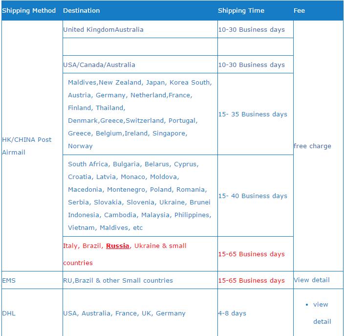 1.)Товары будут отправлены в течение2-5 рабочихДней после подтверждения оплаты. Бесплатная Доставка осуществляетсяПочта Китая авиапочтой/почтой Гонконга;Мы предоставим номер отслеживания для всех способов доставки. Вы можете отслеживать его на официальном wesite.