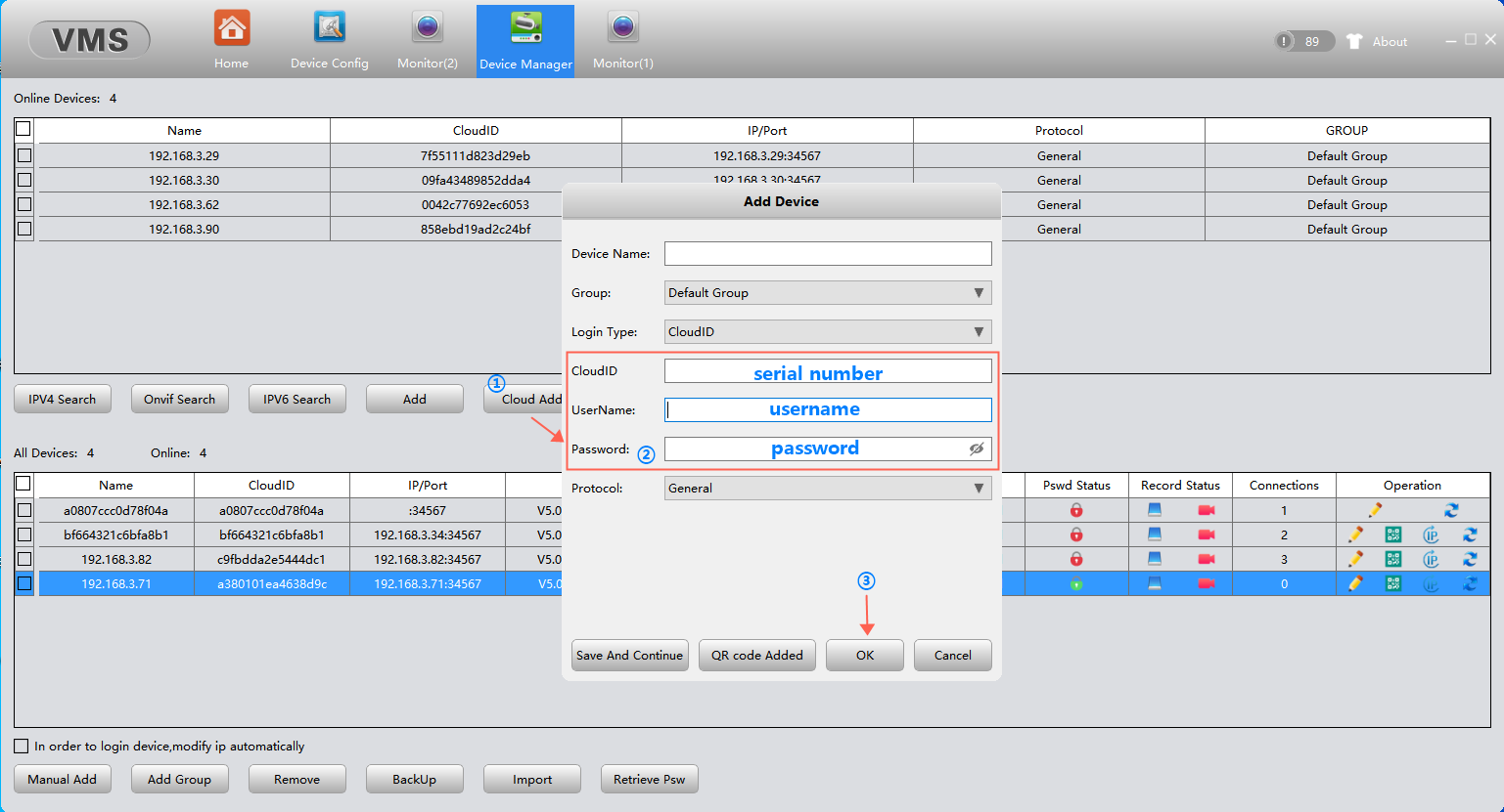 ② Найдите полный серийный номер, пароль и имя пользователя в приложении icsee, введите их в программное обеспечение VMS и успешно добавьте.