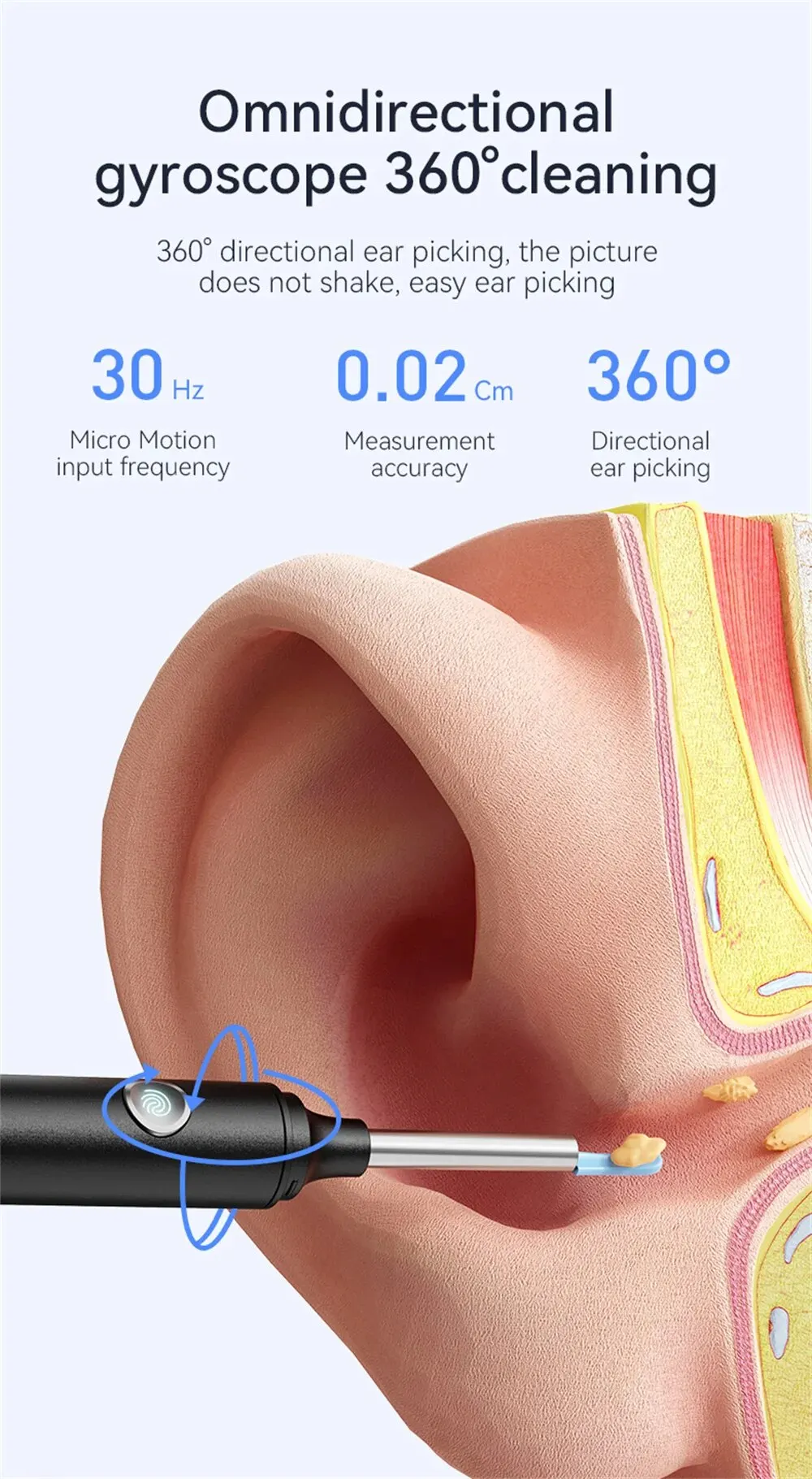 [Эффективная Чистка ушей]: С передовой технологией визуализации и универсальным 3-осевым гироскопом вы можете очищать ушную серу более эффективно и результативно, чем традиционные инструменты для чистки ушей. Еще лучше, инструмент Бережный и Безопасный в использовании.