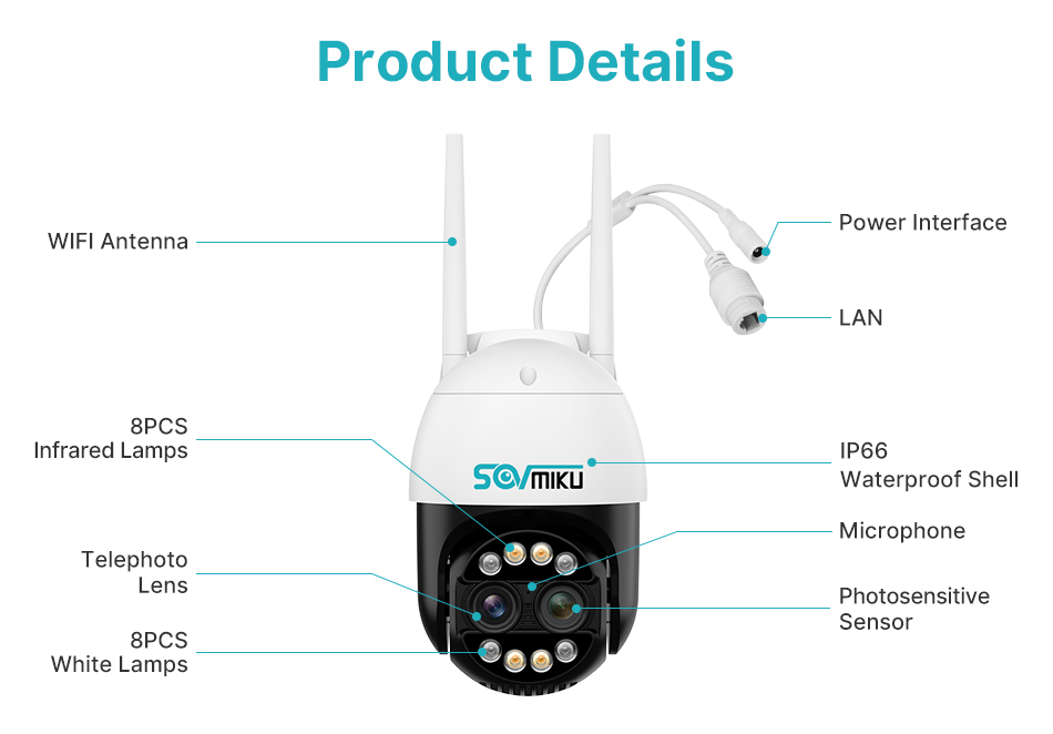 Встроенные белые светодиоды и светодиодные фонари с ИК-подсветкой, расстояние ночного видения до 50 метров, так что вы можете получать высококачественное видео даже ночью.