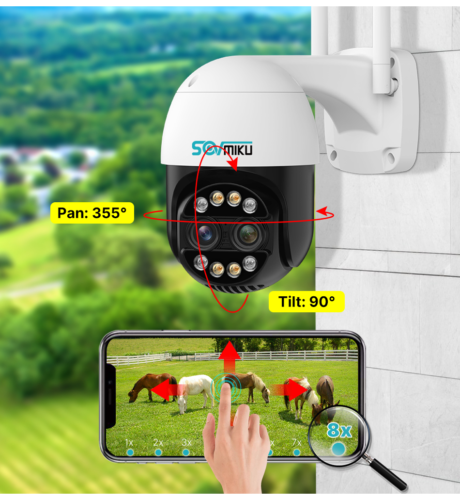 Камера имеет широкоугольный объектив и объектив с большим фокусным расстоянием, которые поддерживают 8-кратный Гибридный оптический зум для захвата дальнейшего обзора. Когда зона предупреждения находится слишком далеко, вы можете выбрать функцию масштабирования, чтобы получить больше информации, чем камера видеонаблюдения с одним объективом.