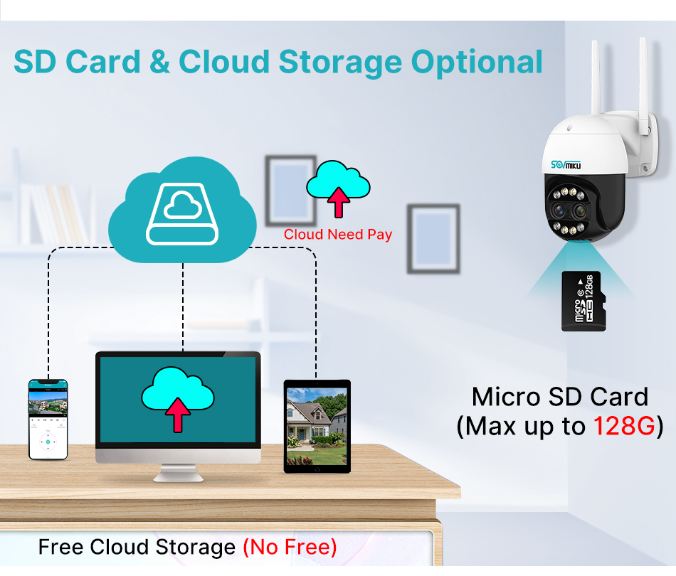 Камера видеонаблюдения может хранить изображения и видео через SD-карту (опционально) или Облачное хранилище (требуется подписка), вы можете просматривать сохраненные моменты в любое время через приложение или карту памяти. (С картой памяти, поддержка воспроизведения)